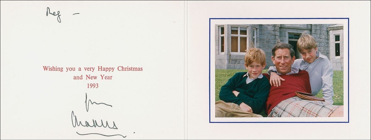 Royal Christmas card from 1992, measuring 16 x 6 open, featuring an affixed color photo of Charles posing with his sons William and Henry, signed and inscribed inside in black ink, “Reg—from, Charles.” In fine condition. Accompanied by the original mailing envelope.
