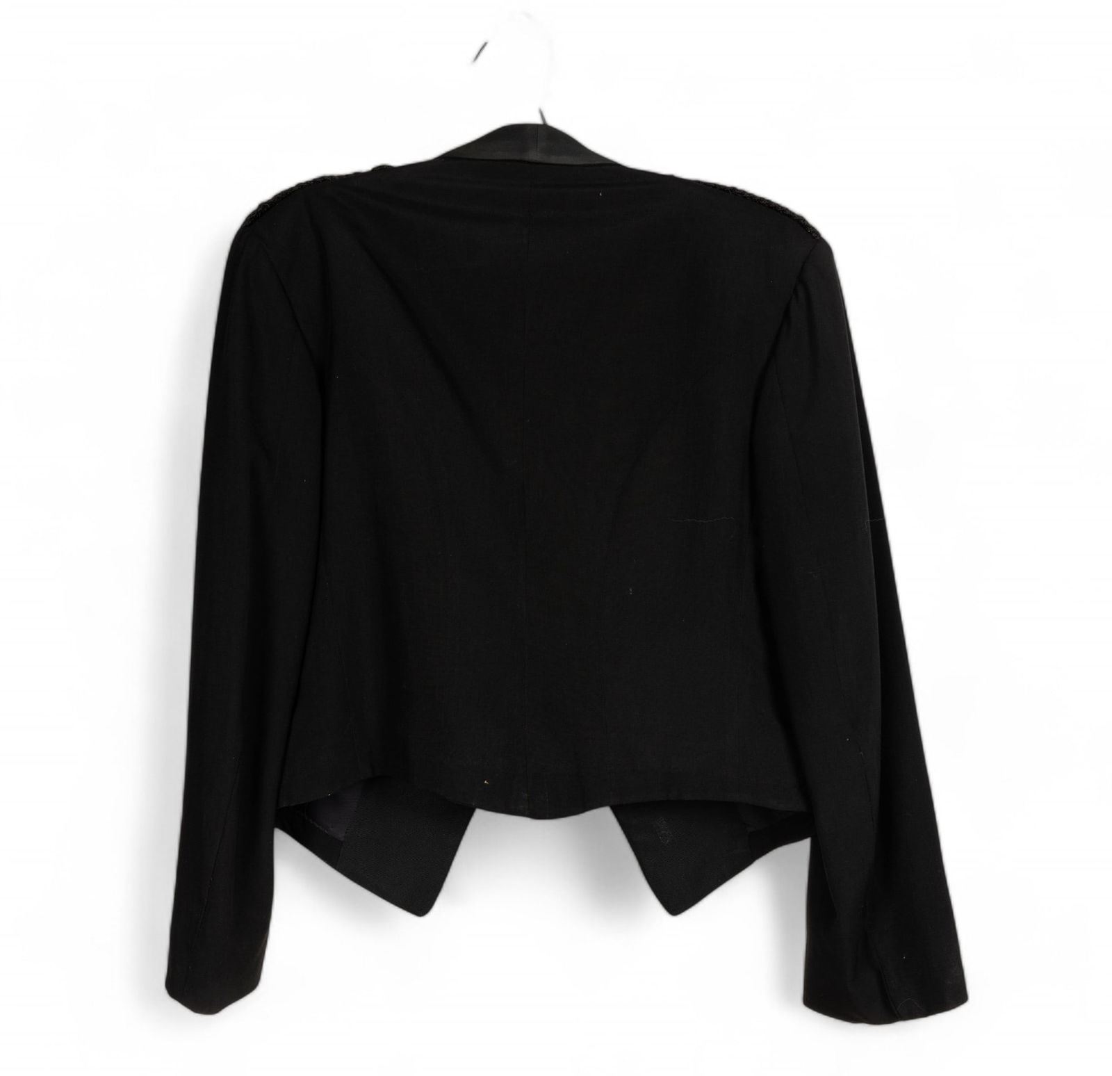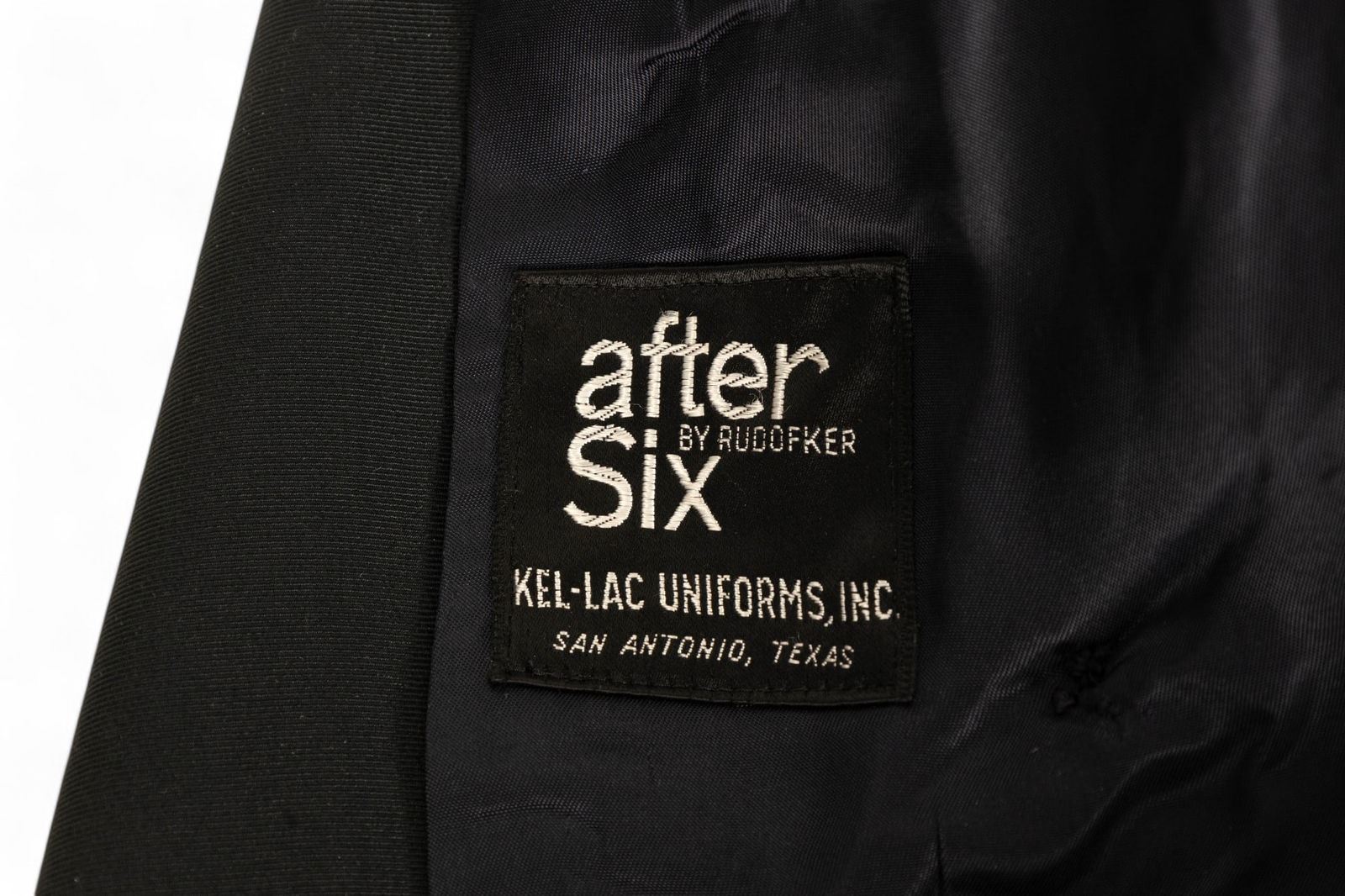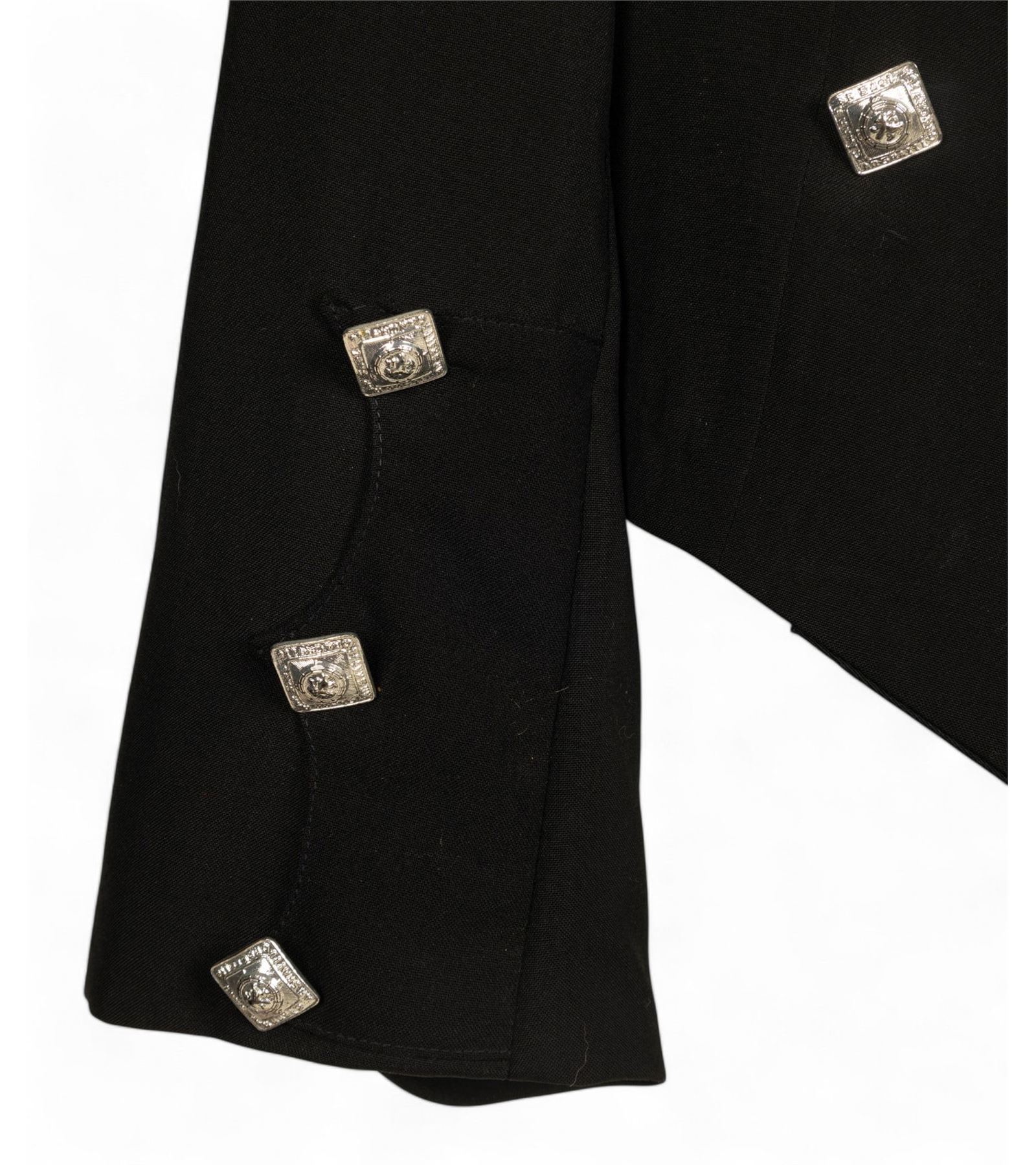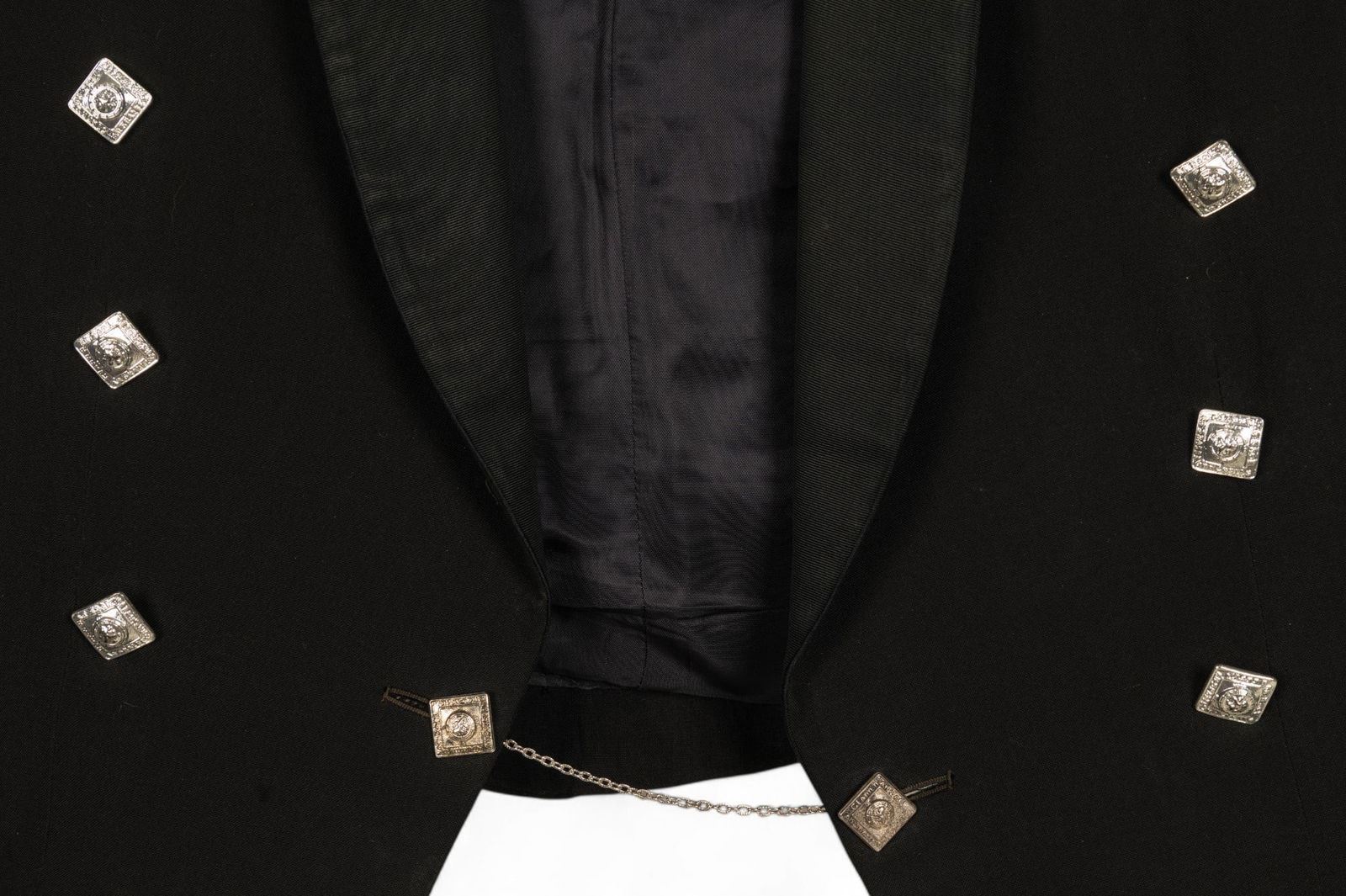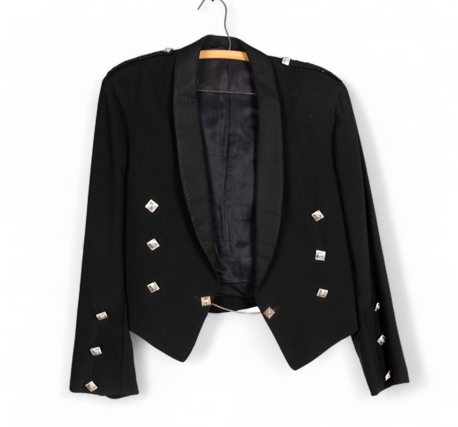 Black Prince Charlie kilt jacket with silver tone Clann Nar Sael buttons, 19" shoulders, made by After Six by Rudofker, Kel-Lac Uniforms San Antonio, TX.