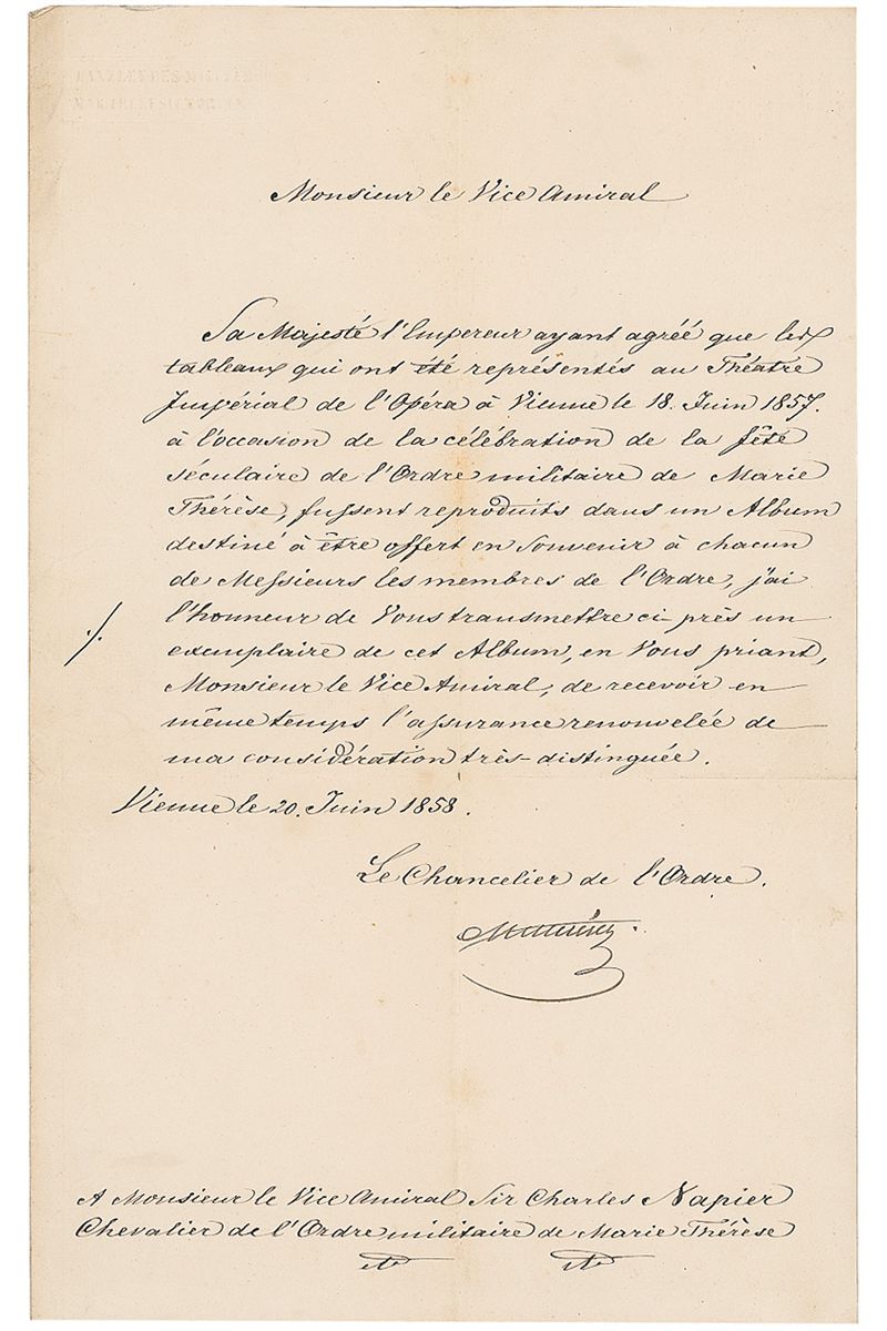 Prominent Austrian politician and diplomat (1773–1859). Manuscript LS, in French, signed “Metternich,” one page, 8.25 x 13, June 20, 1858. An official letter sent to Vice Admiral Sir Charles Napier (1786-1860) probably the navy officer most widely known to the public in the early Victorian Era. Metternich sends an art album with reproductions of the paintings presented at the Vienna Opera. Intersecting folds and scattered light toning, soiling, and creasing, otherwise fine condition.