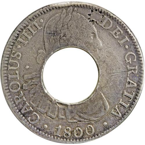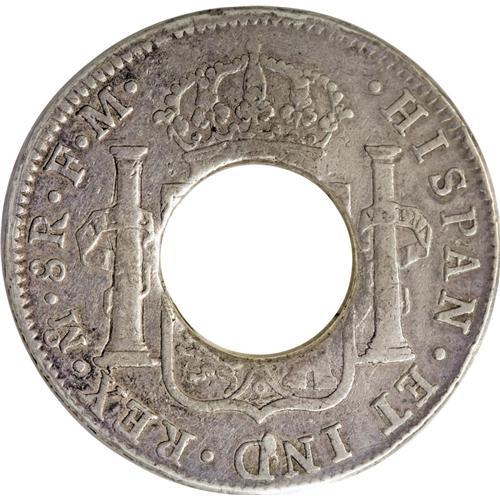 <B>Prince Edward Island Holey Dollar 1813,</B></I> CH-PE1, KM2, circular counterstamp of 10 triangles on a center punched 1800 Mo 8 Reales, VF20 ICCS. A method developed by the new PEI governor in 1813 to create a local currency that would be used and remain only on the island.<BR><I>From the Dominion Collection.</B></I>