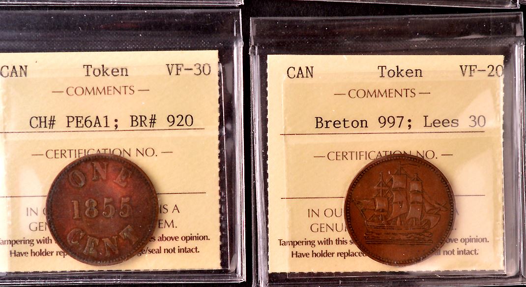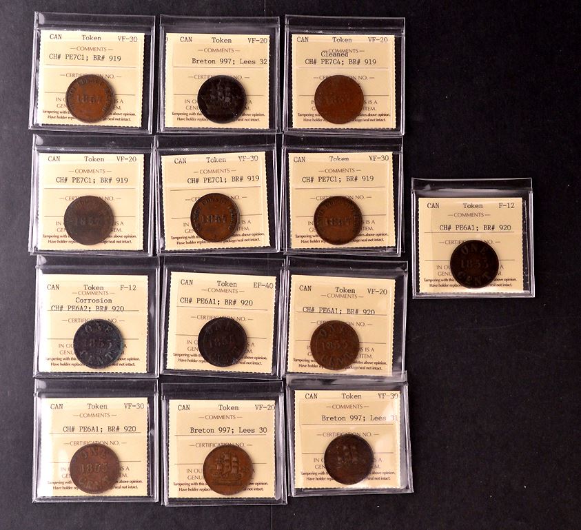 ICCS graded Prince Edward Island, Cents, Br.919, PE7C1, VF-20; VF-30, (3); PE7C4, VF-20, Cleaned; Br.920, PE6A1, (4), F-12; VF-20: VF-30; EF-40; PE6A2, F-12, Corrosion; Ships, Colonies & Commerce, Br.997, Lees 30, VF-20; Lees 31, VF-30; Lees 32, VF-20; total of 13 pcs.