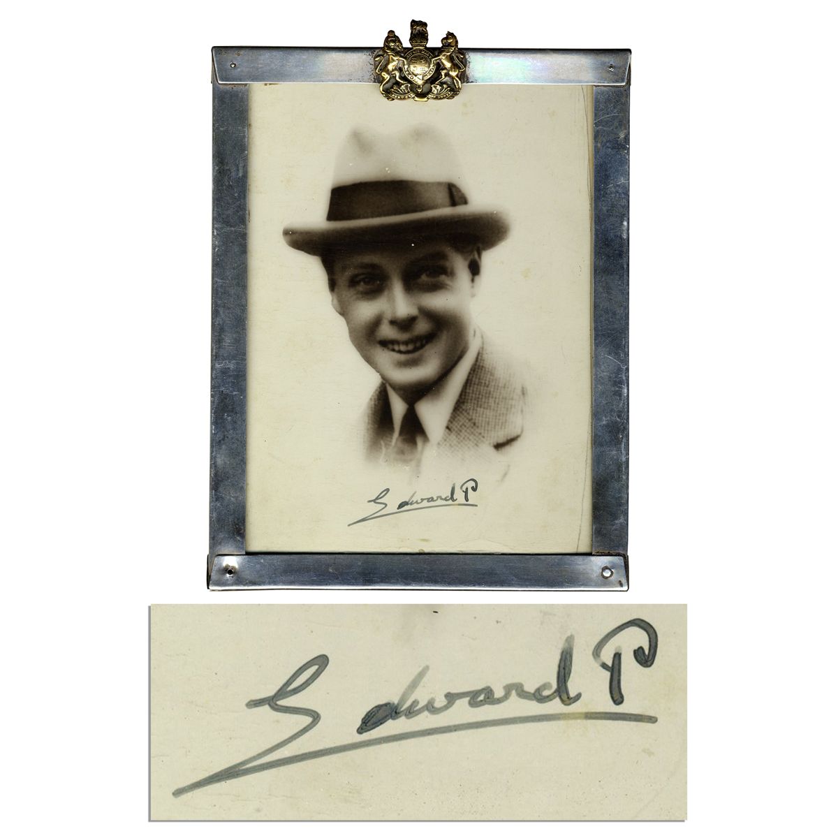 The Duke of Windsor, Edward VIII signs ''Edward P'' on a boyish photo of himself. The photo of the young Prince is framed, upon which a metal crest is affixed which reads ''Dieu Et Mon Driot'', French for ''God and my right''. Photo measures 5.75'' x 7.75''. Creasing near tail edge, some specks of paper loss to Edward's image, and pencil lines to right edge. Frame measures 7'' x 9''. Very good condition.