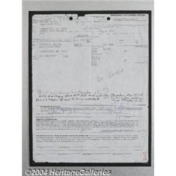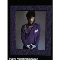 <B>Prince Emergency Out-Patient Record Signed with Full Name!</B></I> Prince is one of our most reclusive and mysteriously private icons. It is exceedingly difficult to acquire anything personally signed by him, and that is exactly what makes this lot truly amazing and fantastic. On January 19, 1981, at 8:50 AM, Prince R. Nelson arrived at the Fairview Southdale Hospital Emergency Room in Minnesota, complaining of congestion. He was treated and released. The documentation is all here, plus three handwritten entries from April and May of 1981, documenting unsuccessful attempts to receive payment for the medical services rendered! In the space for signature that guarantees payment at time of treatment, he has signed his name in full: "Prince R. Nelson." The hospital paper is matted in black velvet with a great color photo of the artist, which is further matted in purple lace, increasing the overall size to 22x33. This lot is truly unique! <I>Accompanied by COA from PSA/DNA. </B></I> <BR><BR><B>Important notice:</B> Heritage usually auctions material at the rate of 200-250 lots per hour. On some occasions eBay Live bid software or the Internet may not be able to keep up with the pace of the auction. We recommend placing a realistic absentee bid now as insurance to avoid disappointment. Occasionally the auctioneer may eliminate or reject an eBay Live bid, and the auctioneer may also reopen a lot after the close of the eBay live bidding (usually because we missed an audience bid), and may reject your bid even if it shows you as the winning bidder. By bidding via eBay Live, you agree that Heritage may award the lot to another bidder at its sole discretion under the circumstances described above or any other reasonable circumstances. Since eBay bids are not shown to us until we open the lot on the floor, we treat those bids just like floor bids. In most cases the floor responds before the eBay bid is presented to us, due to Internet lag time, so for consistency we have made it a policy that floor bids are always considered first over tie eBay live bids. Also please note that all Heritage lots purchased through eBay Live carry a 24.5% Buyer's Premium. Please make sure you read the Terms and Conditions before you bid.