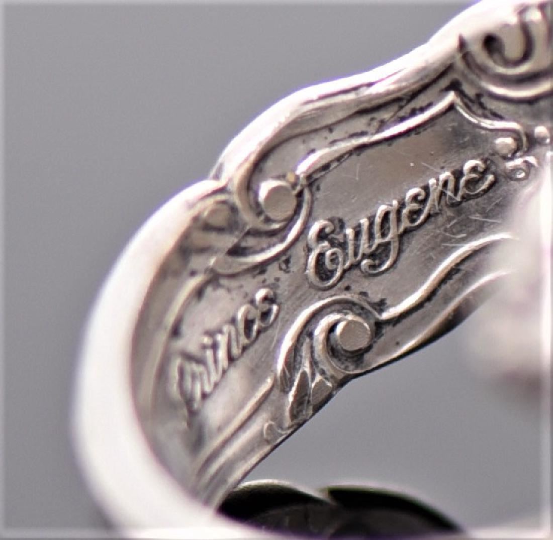 Prince Eugene Sterling Silver Spoon Ring, c. 1950's. Ring Size 5. Estimated more than 50 yrs old. 925 Sterling Silver consisting of 92.5% silver and 7.5% copper. Tested Positive using Nitric Acid Chemical Scratch Test, Cloth Rub Test, Smell Test, and Magnet Test. No Markings. The reason silver needs to be combined with other metals is that it is very difficult to make great designs with just pure silver, which is very soft and malleable. A bit of hardness has to be introduced by adding other metals such as copper. That is why jewelers are capable of making the most intricate an complex designs with 925 Sterling Silver. Silver is one of the most valuable elements next to gold. Mexico is the leading producer of sliver, followed by the United States, Canada, Australia, Spain, Peru, and Russia. Many countries do not require their precious metal items to be stamped and therefore we test to ensure we accurately represent the product. Size and/or Weight: See Measurement Photo. (Photos Represent The Lot Condition.)