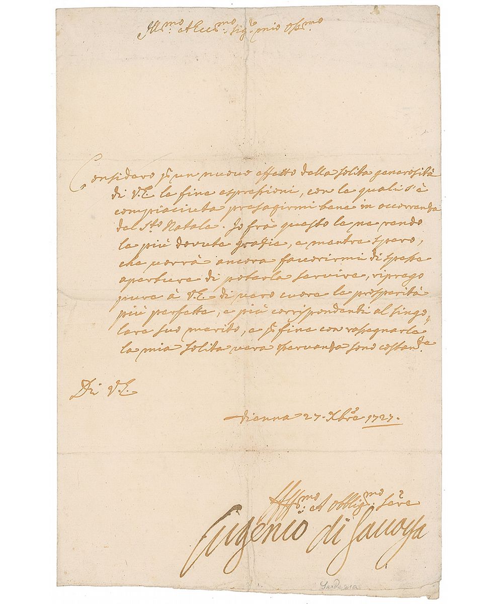 One of the most successful military commanders in modern European history (1663–1736). Manuscript LS, in German, signed “Eugenio di Savoya,” one page, 8.5 x 13, 1727. Untranslated letter boldly signed at the conclusion by Eugene. In very good condition, with intersecting folds, one through a single letter of signature, scattered creases, mainly to edges, and a pencil notation along bottom.