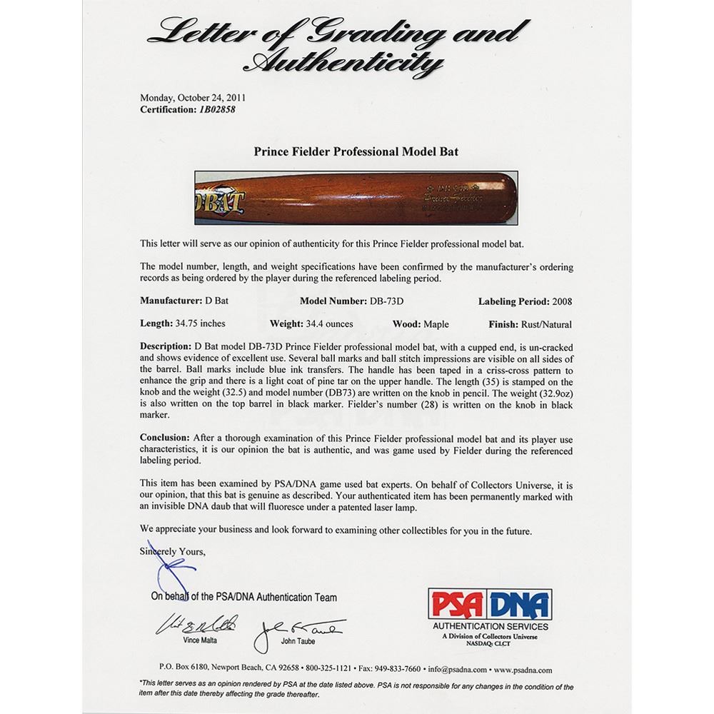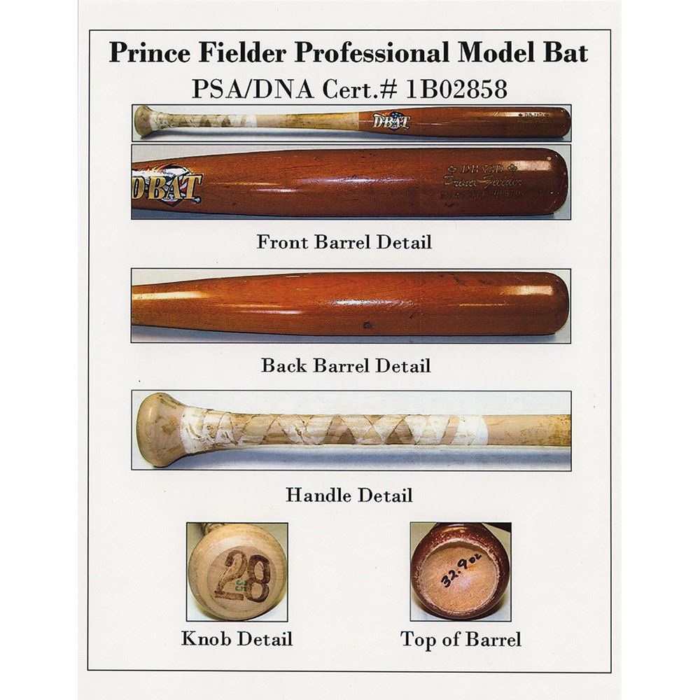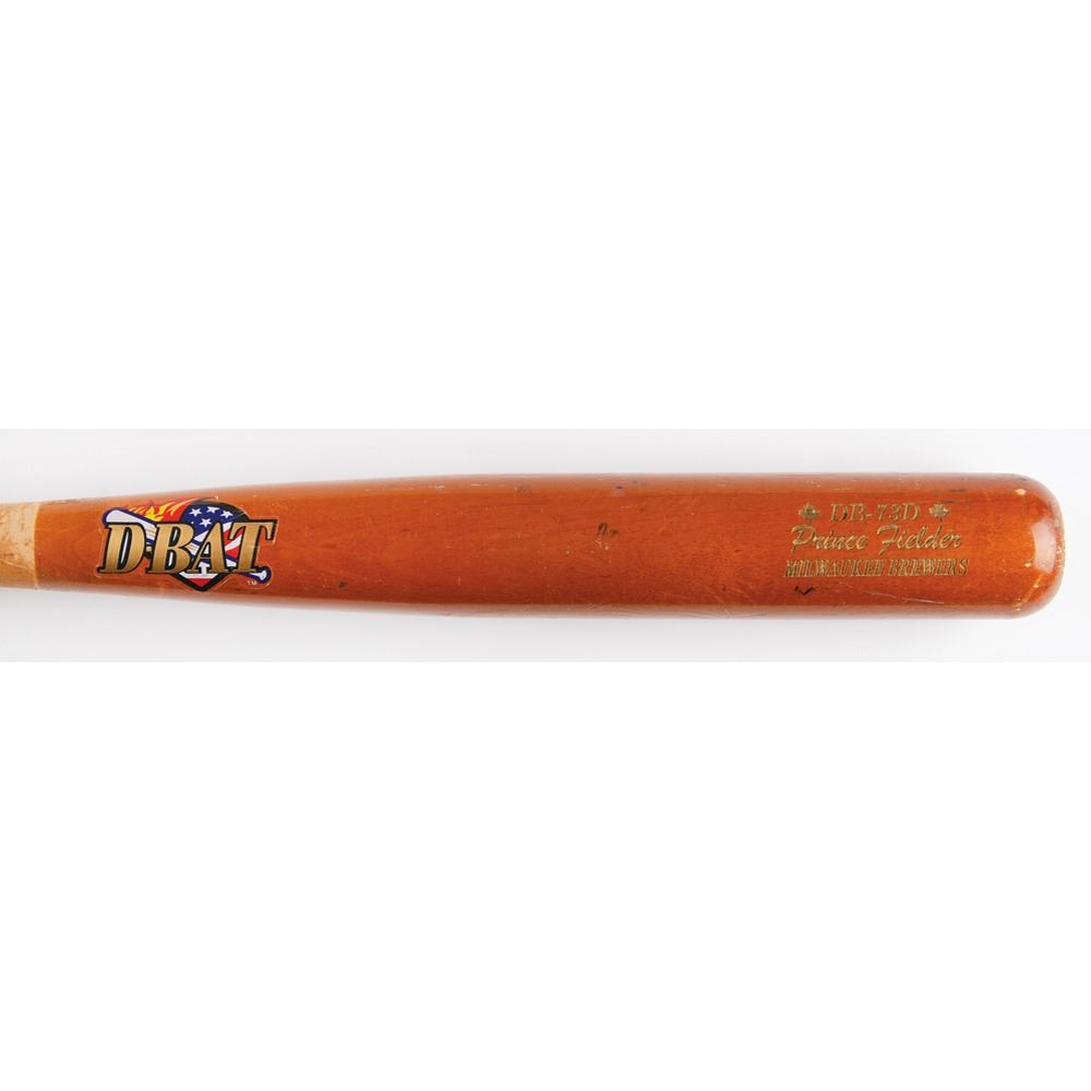Prince Fielder's game-used personalized D Bat DB-73D baseball bat, used by Fielder as a member of the Milwaukee Brewers during the 2008 season. The end of the knob is marked with his Brewers uniform number, “28.” In very good to fine condition, with obvious expected signs of use, such as ball marks and stitch impressions. Accompanied by a full letter of authenticity from PSA/DNA, which concludes that “the bat is authentic, and was game used by Fielder during the referenced labeling period.” After a breakout 2007 season, Fielder delivered impressive batting numbers across the board in 2008, including 162 hits, 30 doubles, 34 home runs, and 102 RBIs.
