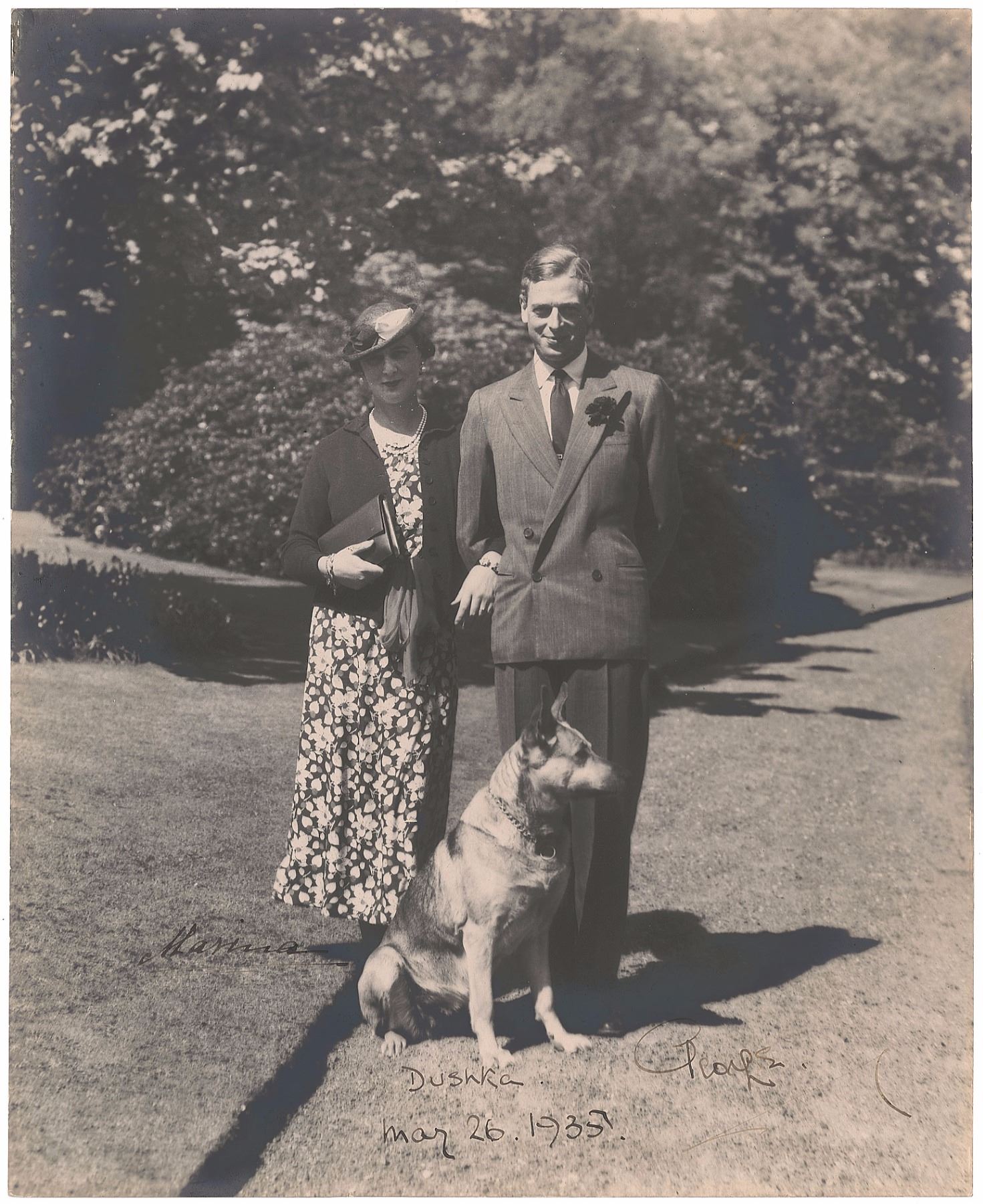 George was the fourth son of George V of the United Kingdom and his queen, Mary of Teck, (born 1902) who held the title of Duke of Kent from 1934 until his death in a military air-crash in 1942. Marina (1906–1968) was the daughter of Prince Nicholas of Greece and Denmark and Grand Duchess Elena Vladimirovna of Russia. Vintage matte-finish 9.75 x 12 full-length photo of Prince George, Duke of Kent posing with Princess Marina of Greece and Denmark and their German Shepherd, signed in fountain pen, "Marina" and "George," who adds "Dushka" below the dog, as well as the date, "May 26, 1935." In fine condition, with light silvering along the edges. A highly appealing portrait of the couple less than a year into their marriage.