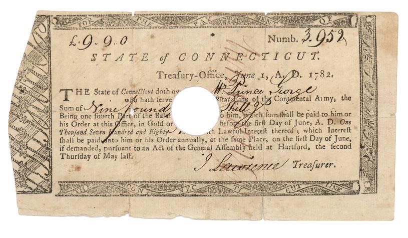 Note Number 3952 for £9.9.0 issued to Mr. Prince George. The note is unsigned. Prince George, a resident of Branford, Connecticut, served in the Connecticut Line of the Continental Army from 1777 to 1782. Prince George is also listed as a member of the all black 2nd company, 4th regiment of the Connecticut Line. This company, consisting of 48 black privates and NCOs, was formed in October of 1780 and served until November 1782. Circular punch cancellation. Splits at folds and some paper loss at intersection of vertical and horizontal folds. Fine.