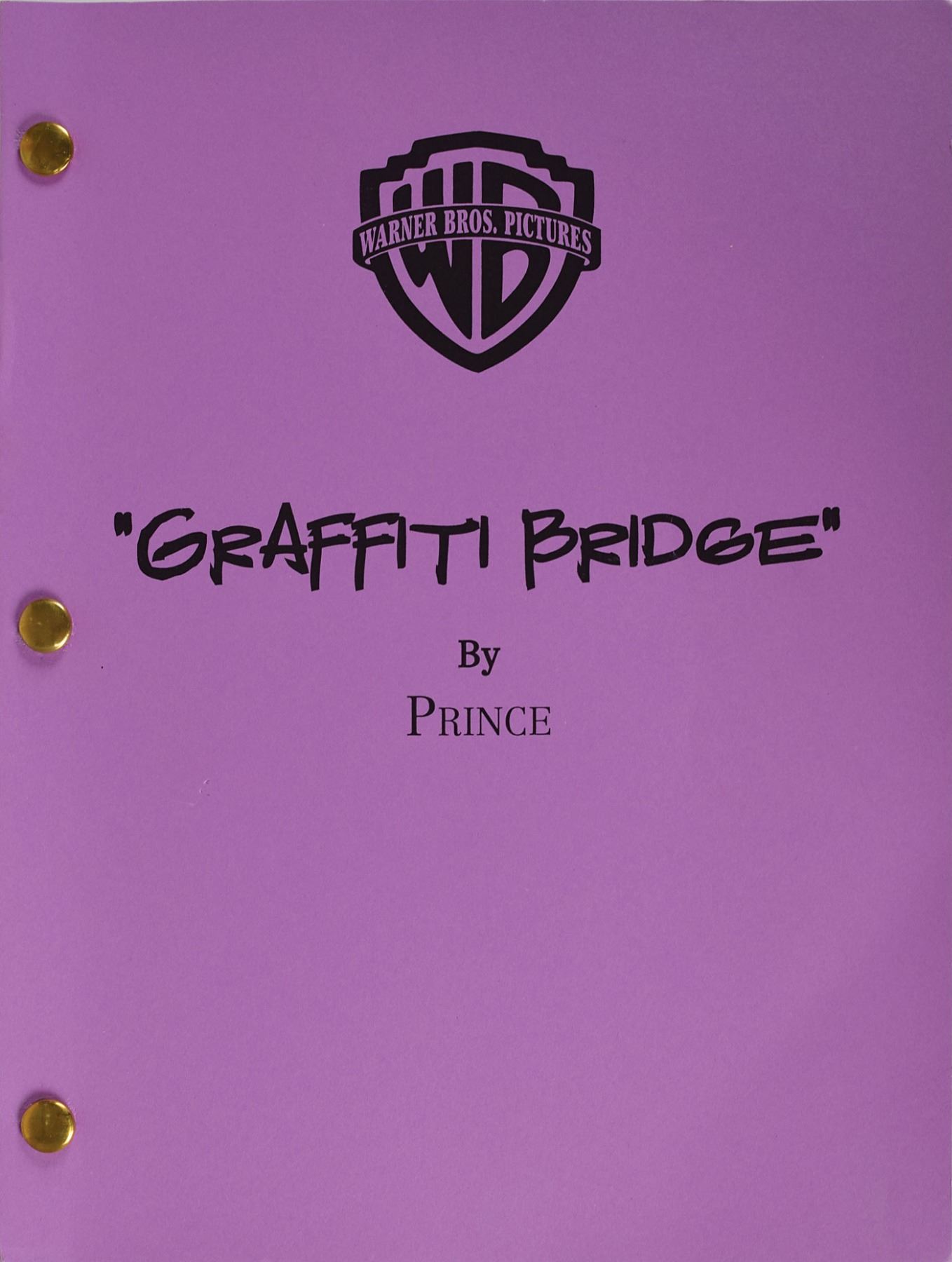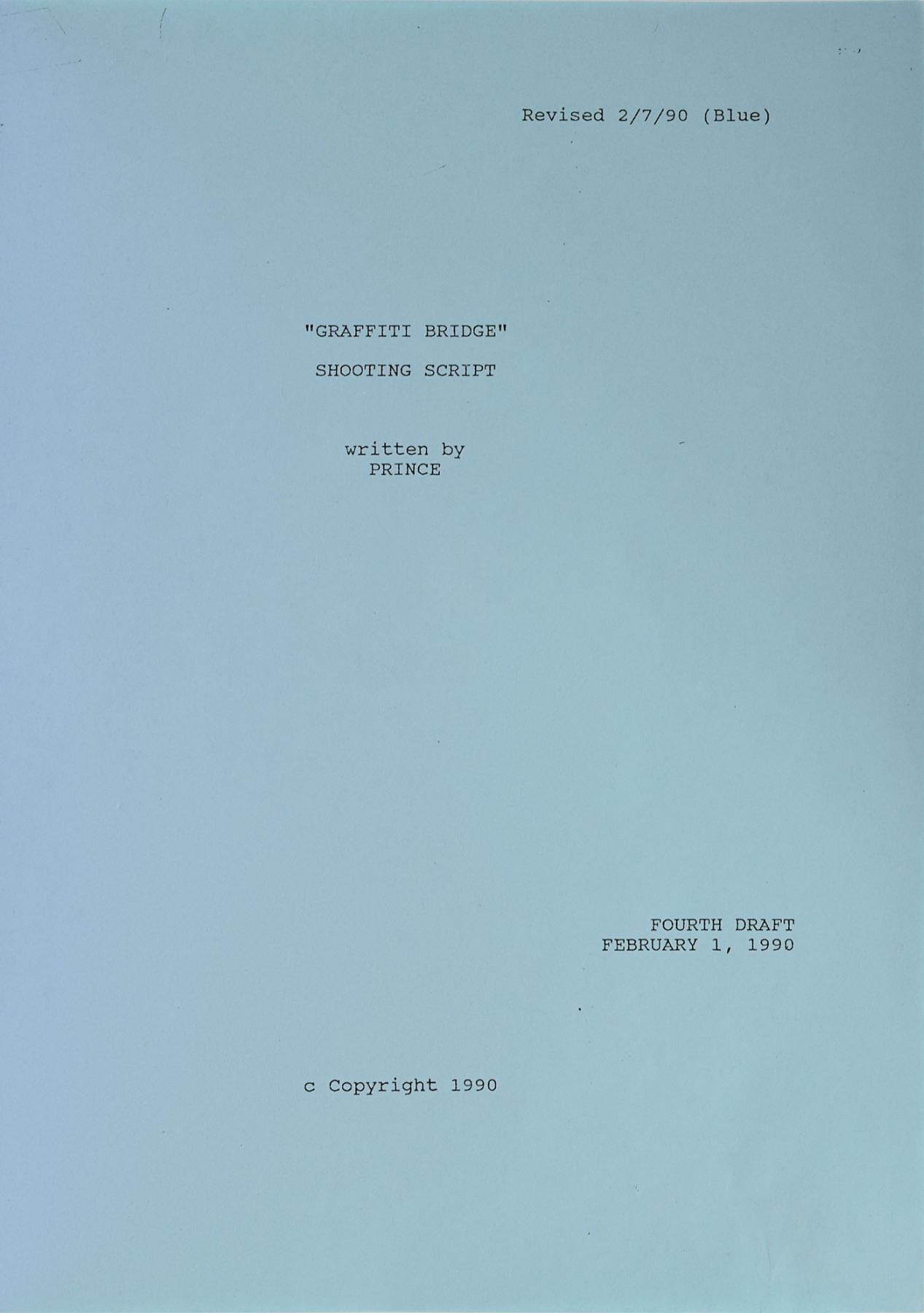 Brad-bound Warner Bros. Pictures fourth draft shooting script for the 1990 film Graffiti Bridge, 66 pages, 8.5 x 11, February 1, 1990. Script retains its original purple covers, and features supplementary pages denoting production staff, public relations, and contacts. The final sixteen pages consist of lyrics for the soundtrack songs, which includes: 'Can't Stop This Feeling I Got,' 'Melody Cool,' 'New Power Generation,' and 'Release It.' In fine condition. Consignor notes that the script originates from the personal collection of Joel King, camera operator 'A' for the film, who is listed in the closing production crew list. Accompanied by a copy of the Henderson Independent newspaper from April 19, 2017, which shows King and one of his copies of the script.