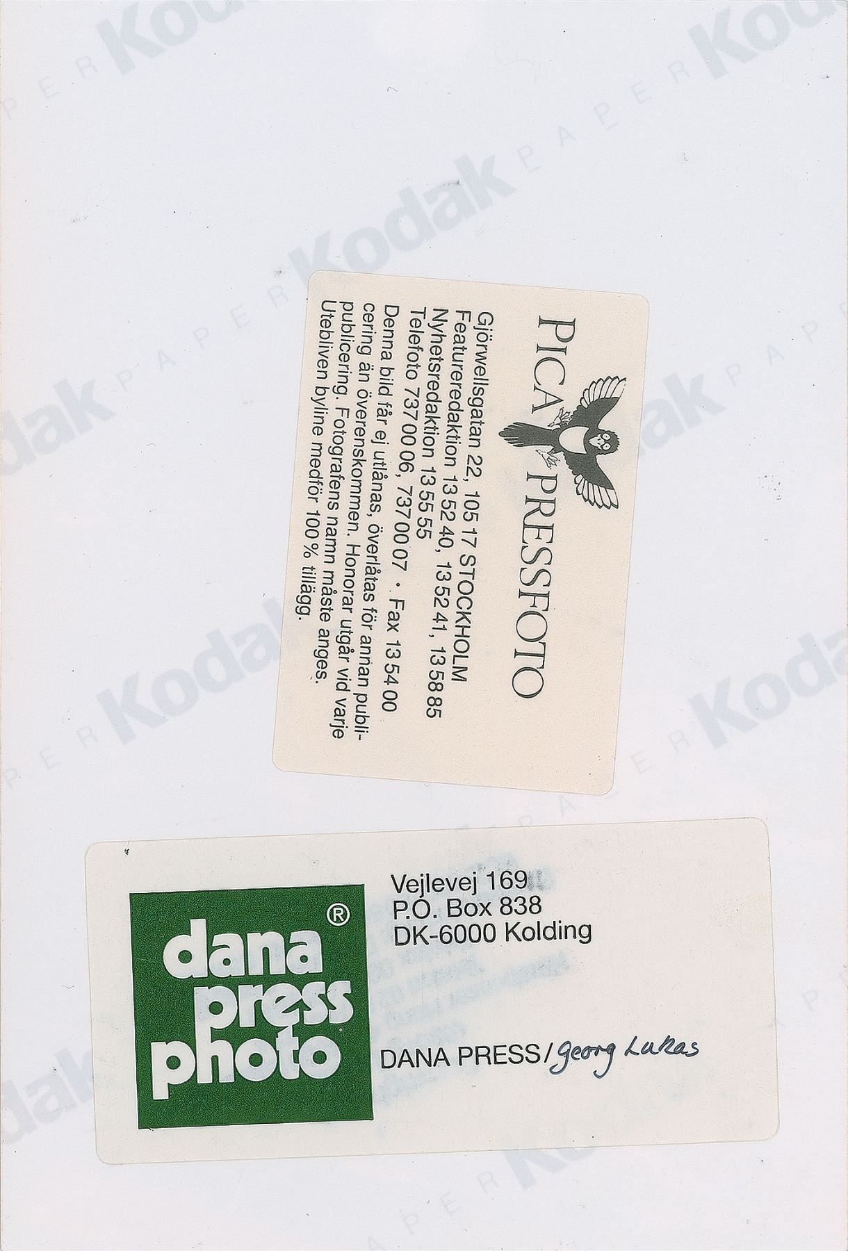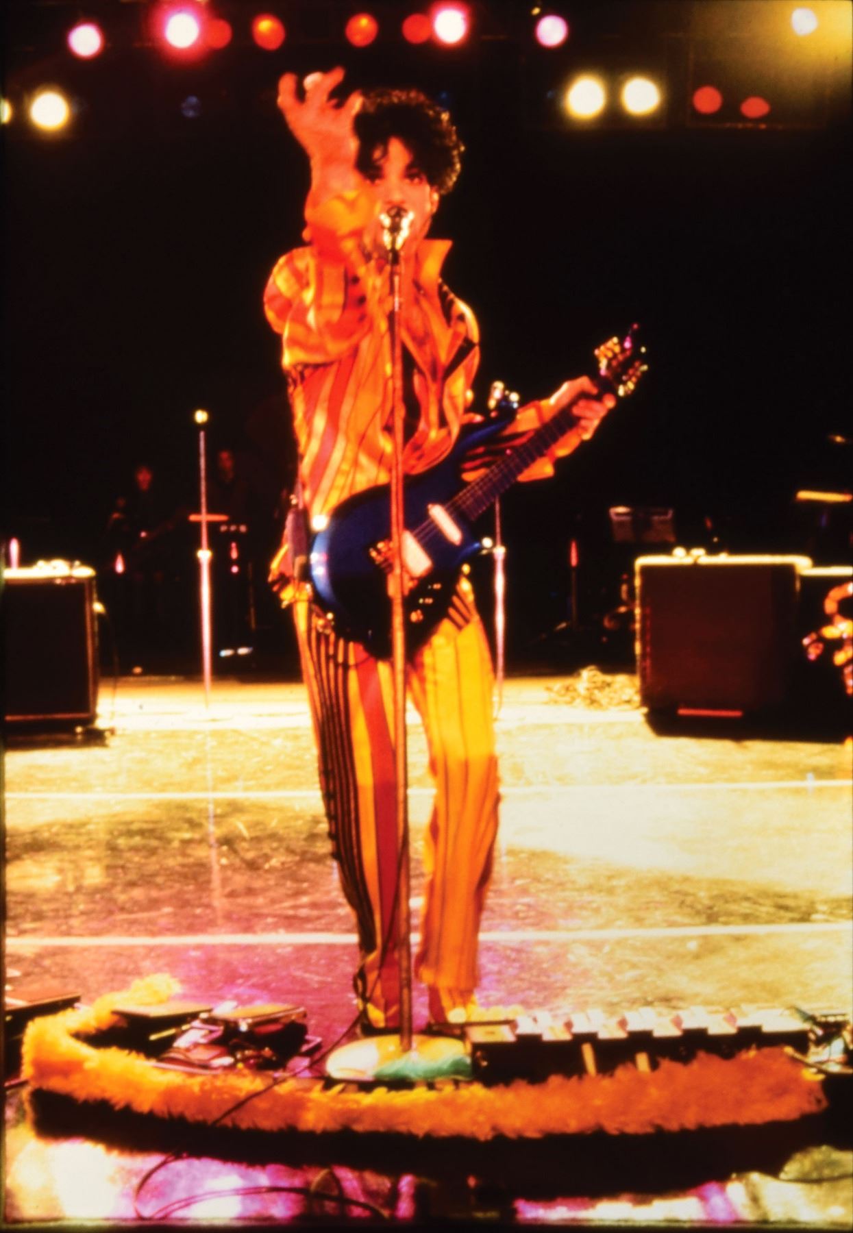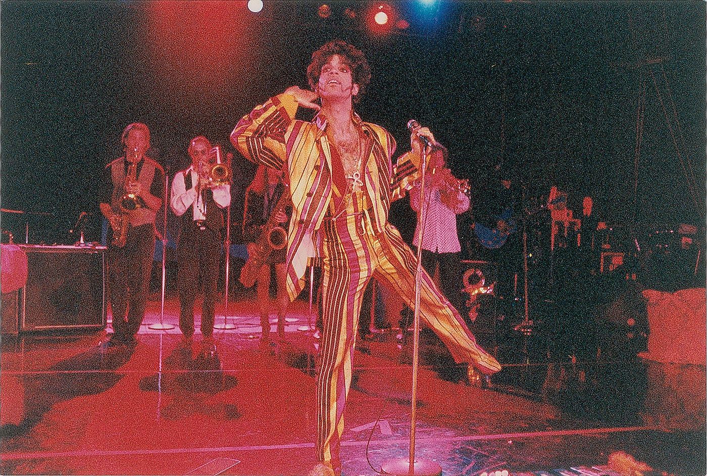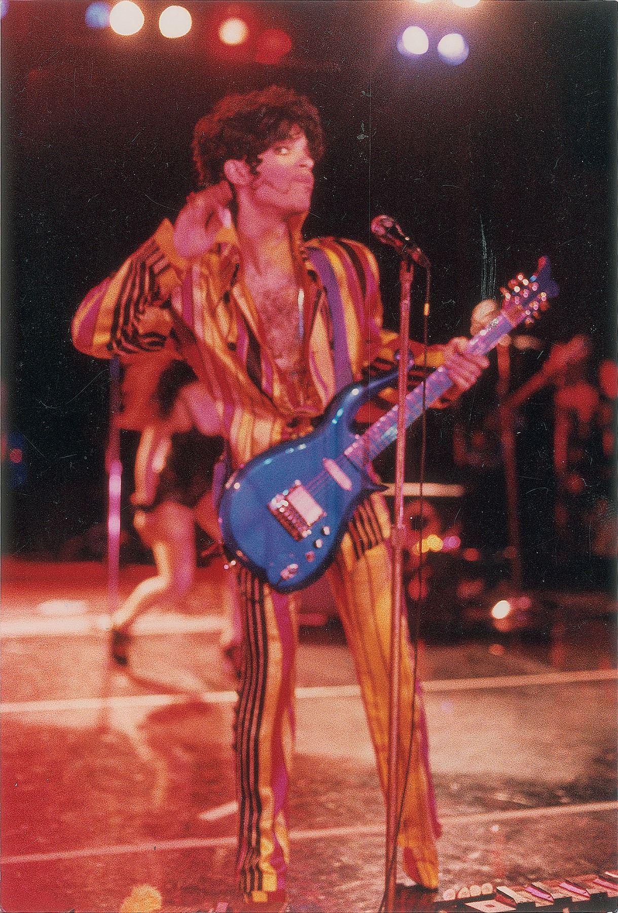 Set of three original color glossy photos, 5 x 7.25 and 7.25 x 5, depicting Prince performing at a benefit show for local radio station KMOJ at Paisley Park studios on July 12, 1993. Each photo shows Prince wearing a flashy striped suit with open chest in front of the microphone; two photos depict Prince playing his gorgeous deep blue Cloud guitar, and another shows Prince standing with a hand to his ear and a horn section playing in the background. Reverse of each photo bears Dana Press/Georg Lukas and Pica Pressfoto credit labels. The photos were originally taken by Stefan De Batselier. Also includes a rare color 2 x 2 London Features transparency slide of Prince from the show, showing him in a full-length pose with golden striped suit and holding his purple Cloud guitar, with caption text attributing the photo to Stefan De Batselier. In overall very fine condition. The consignor notes that while the transparency slide image was published in a 1996 Japanese magazine, the other photos have not been published in print media.