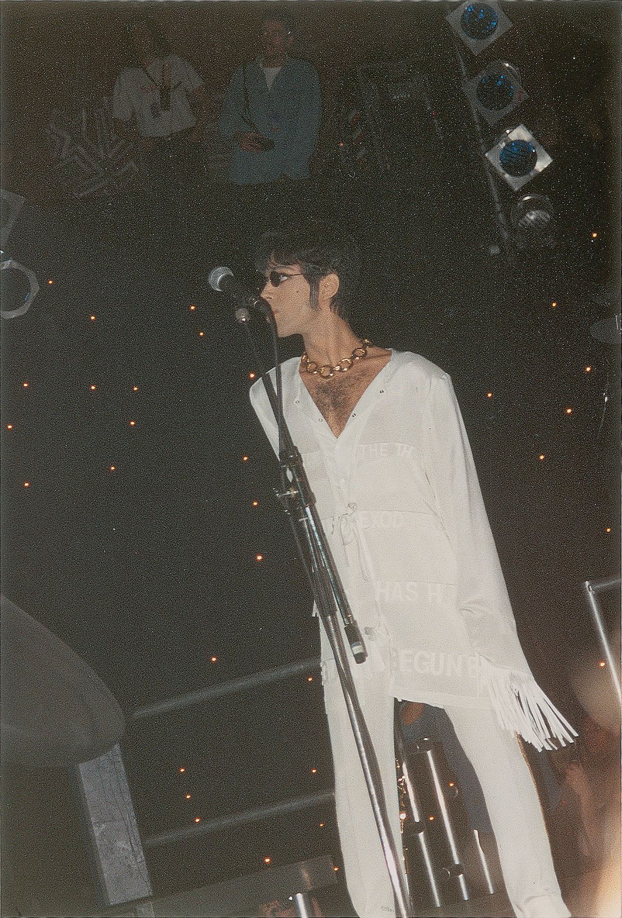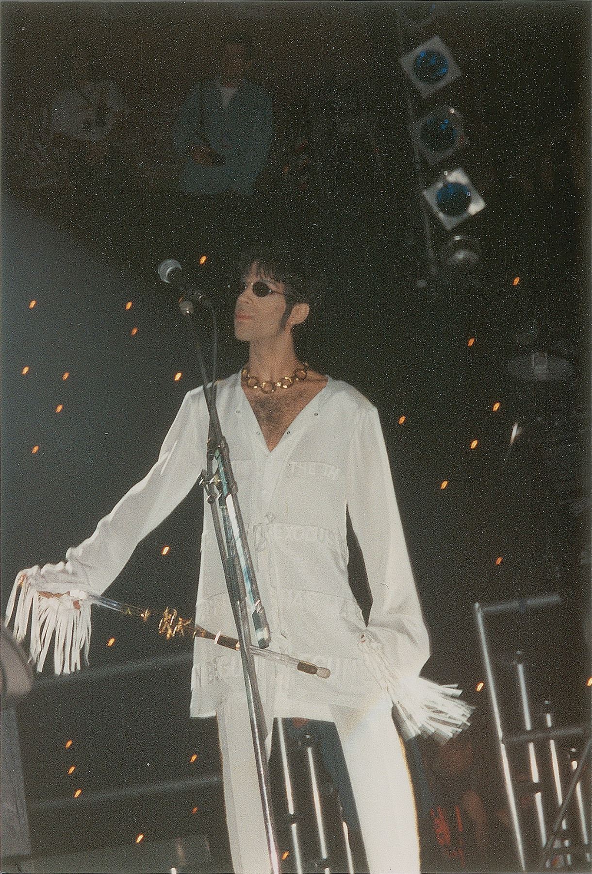 Rare collection of seven unpublished color satin-finish photos, 4 x 5.75 and 5.75 x 4, each depicting Prince during his performance at the relaunch of the VH1 Music Channel at the Roundhouse in London on September 30, 1994; the images show Prince wearing a white loose tasseled smock top bearing the words, "The Exodus Has Begun," and matching trousers and shoes, an oversized golden chain, and holding an elaborate gold and Perspex cane. In overall very fine condition. Accompanied by a sealed Prince 'Letitgo' single cassette, released shortly before Prince's VH1 appearance.