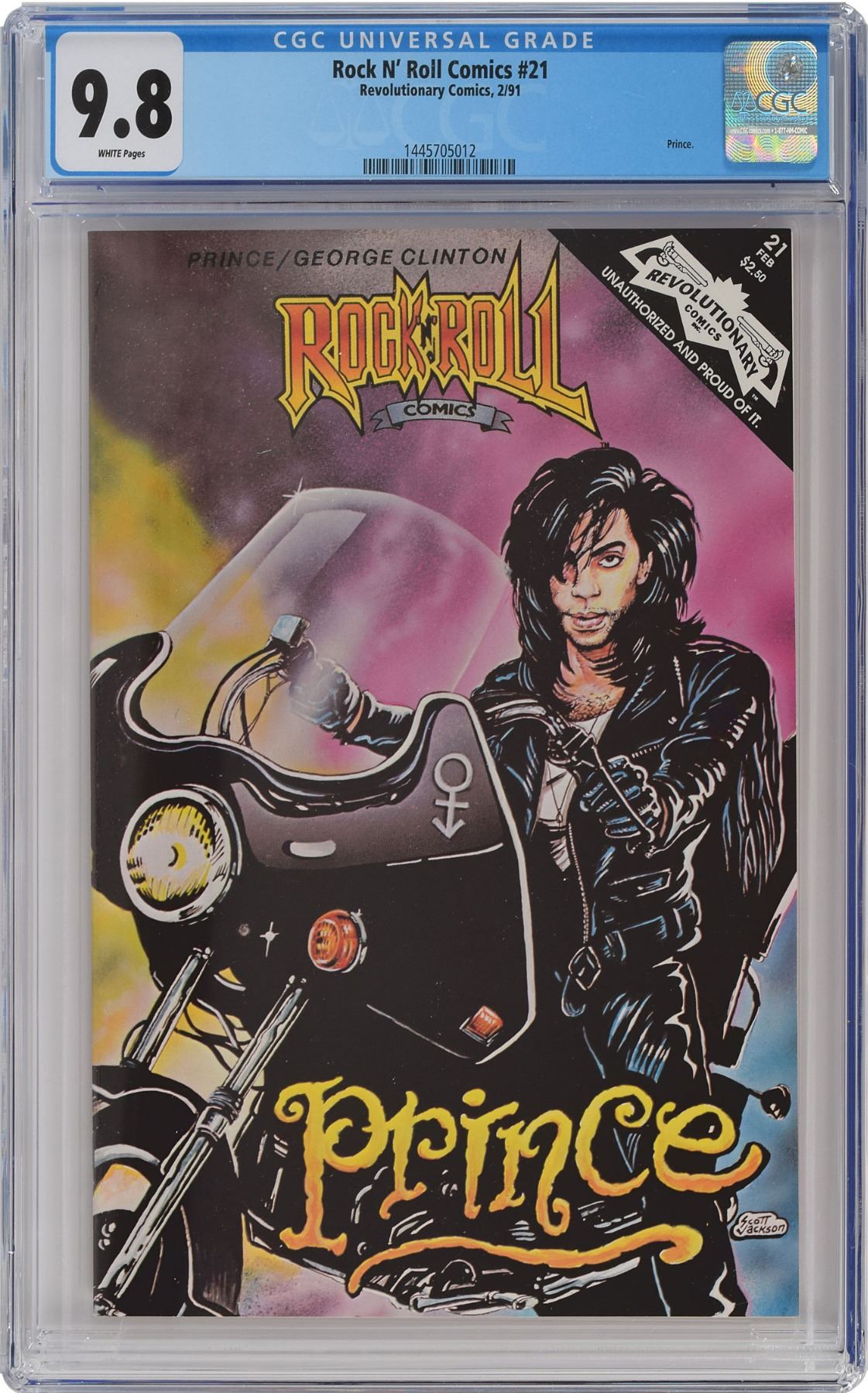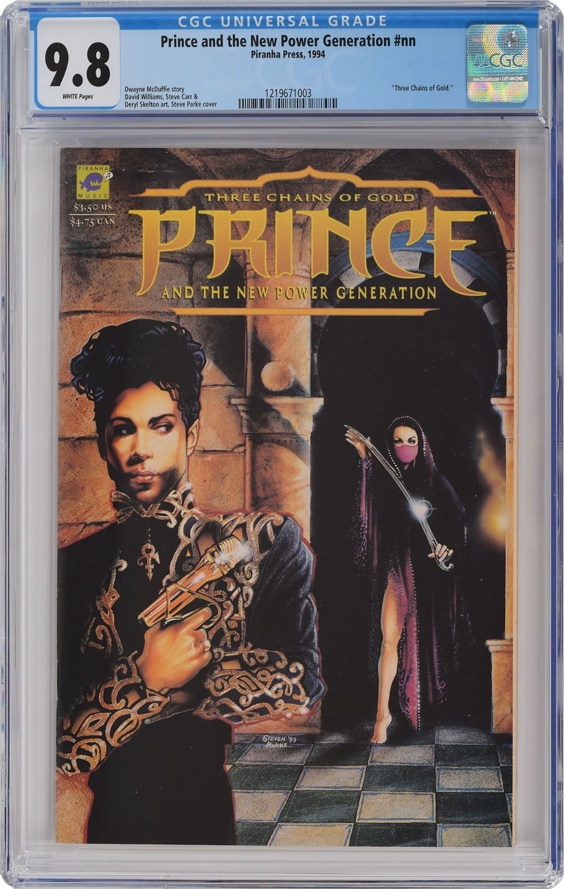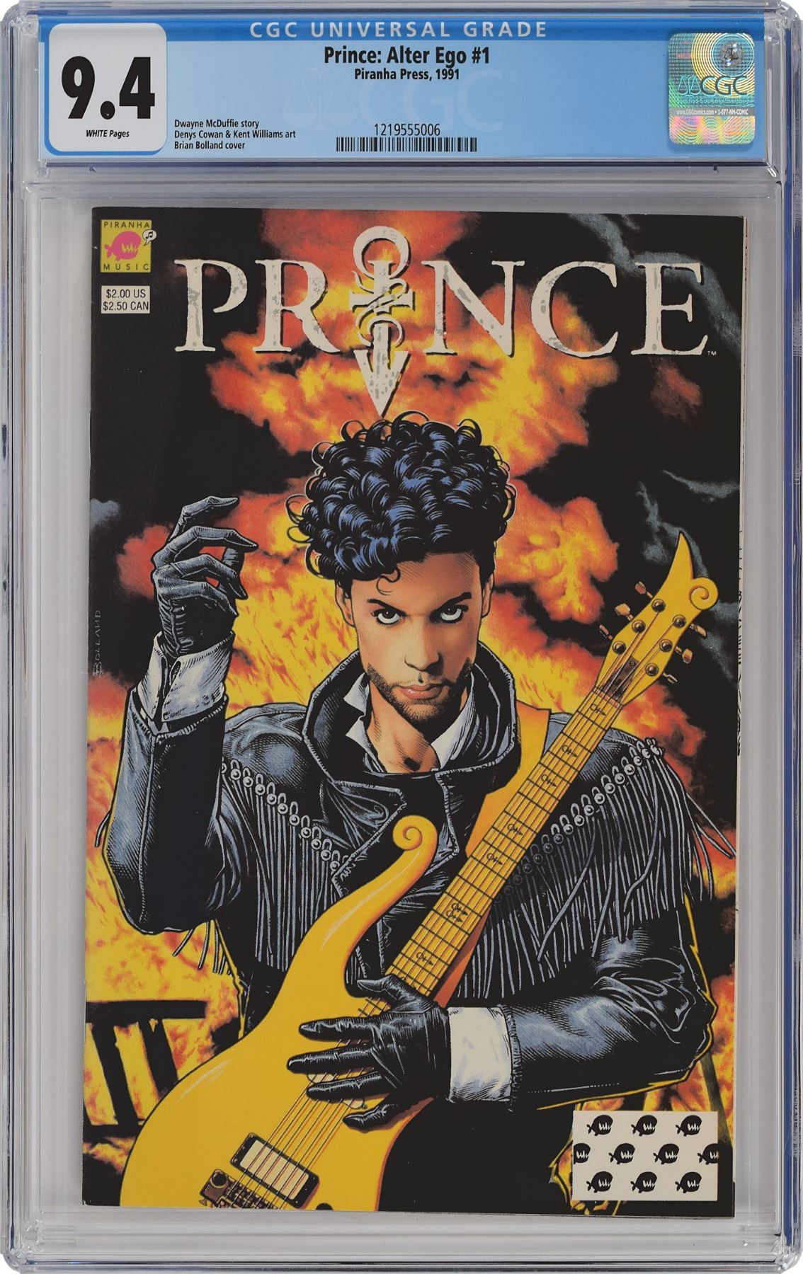 Group of three graded Prince comic books, including: Prince: Alter Ego #1, published by Piranha Press in 1991, graded "9.4" by CGC; Rock N' Roll Comics #21, featuring Prince, published by Revolutionary Comics in February 1991, graded "9.8" by CGC; and Prince and the New Power Generation, published by Piranha Press in 1994, graded "9.8" by CGC. Also includes a commemorative 2016 issue of Billboard magazine. In overall fine condition.