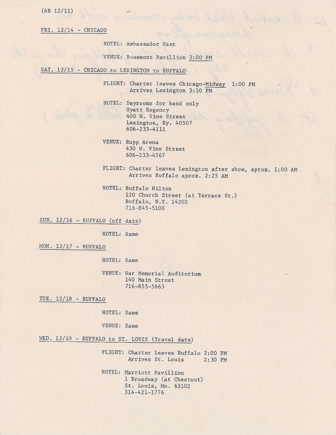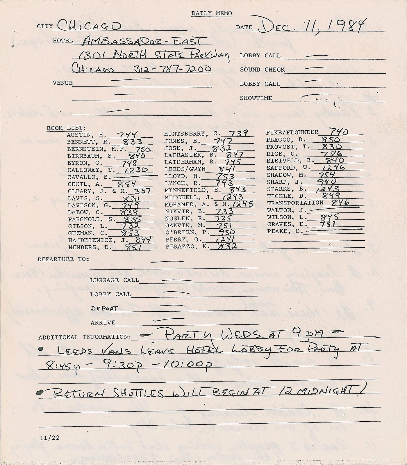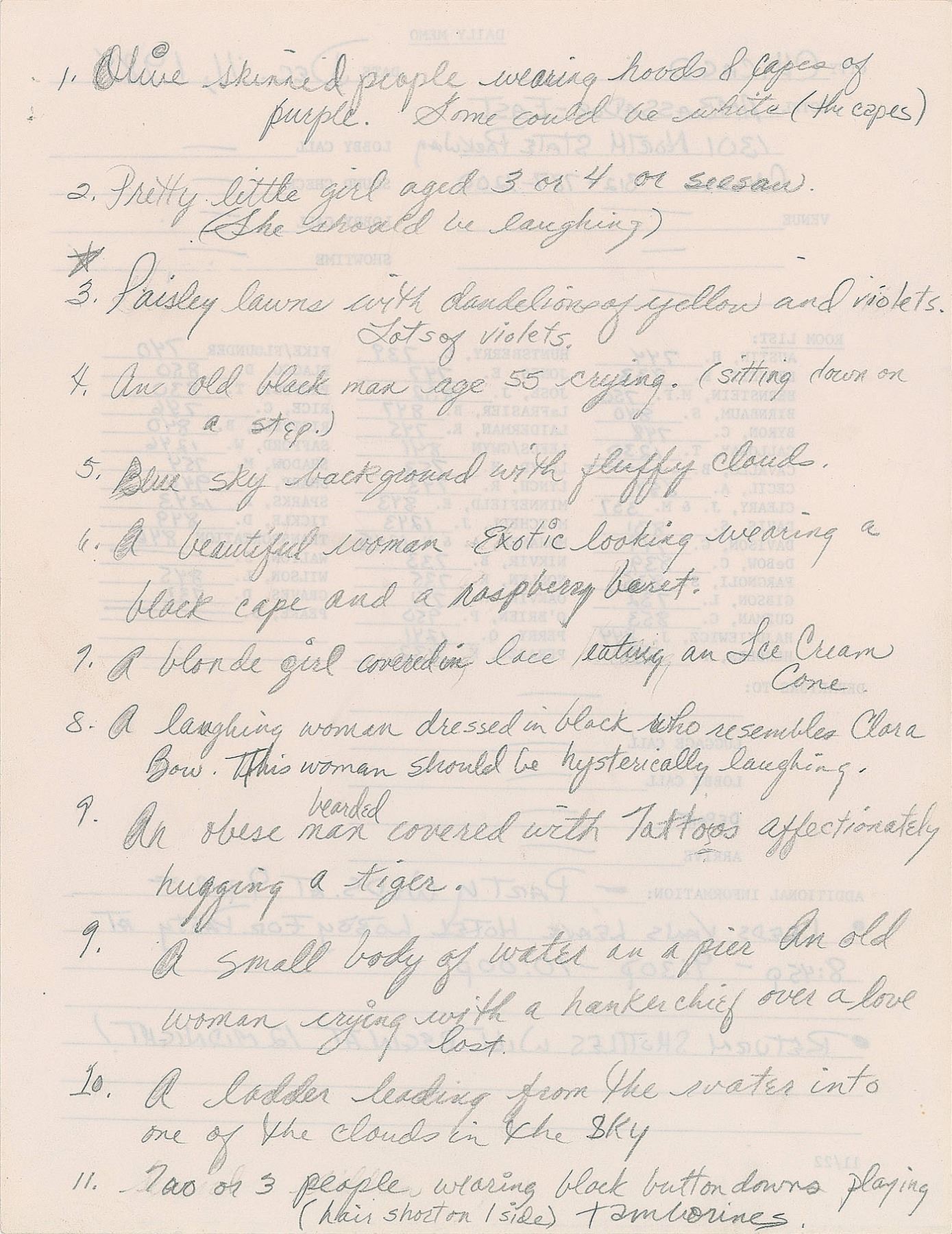 Prince's handwritten instructions to artist Doug Henders for the cover artwork for his 1985 album Around the World in a Day, written in pencil on the reverse of two 8.5 x 11 pages of Purple Rain Tour materials: the first is a daily tour memo with rooming list from Chicago, December 11, 1984, and the second is a page from the tour itinerary for December 12–19, 1984. Prince lists 15 different images to be included in the artwork for the elaborate album jacket, in part: "1. Olive skinned people wearing hoods & capes of purple. Some could be white (the capes), 2. Pretty little girl aged 3 or 4 on seesaw (she should be laughing), 3. Paisley lawns with dandelions of yellow and violets. Lots of violets., 4. An old black man age 55 crying. (sitting down on a step.), 5. Blue sky background with fluffy clouds, 6. A beautiful woman, exotic looking wearing a black cape and a raspberry beret, 7. A blonde girl covered in lace eating an ice cream cone, 8. A laughing woman dressed in black who resembles Clara Bow. This woman should be hysterically laughing, 9. An obese bearded man covered with tattoos affectionately hugging a tiger, 9. A small body of water on a pier, an old woman crying with a hankerchief over a love lost, 10. A ladder leading from the water into one of the clouds in the sky, 11. Two or 3 people wearing black button downs, playing tamborines (hair shorter on one side), 12. A naked black baby running with an American flag, 13. A small Russian fighter jet flying through the sky. (shouldn't be a real focal point), 14. Doves flying and walking, 15. A juggling clown. (two juggling balls a globe)." In fine condition. Accompanied by a color printout of the Around the World in a Day album artwork, which indeed incorporates most of the subjects Prince lists here.
