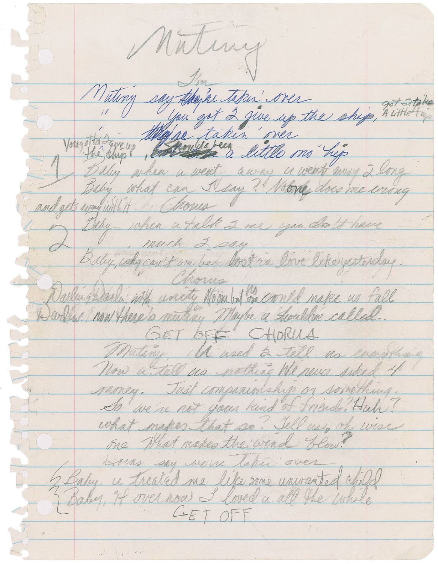 Prince's handwritten draft of the lyrics for "Mutiny" in blue ballpoint and pencil, unsigned, one page, 8 x 10.5, no date but circa 1984. The lyrics begin: "Mutiny say I'm takin' over / You got 2 give up the ship, got 2 take a little trip / they're takin' over / you gotta 2 give up the ship, shoulda been a little mo' hip." Later, he indicates that the "Get Off Chorus" is sung. In fine condition, with frayed notebook holes to the left edge. From the collection of Gwen Leeds, Prince’s assistant tour manager from 1984 to 1988, who notes that Prince would frequently hand write song lyrics in notebooks and then ask that they be typed and supplied for registering and licensing.