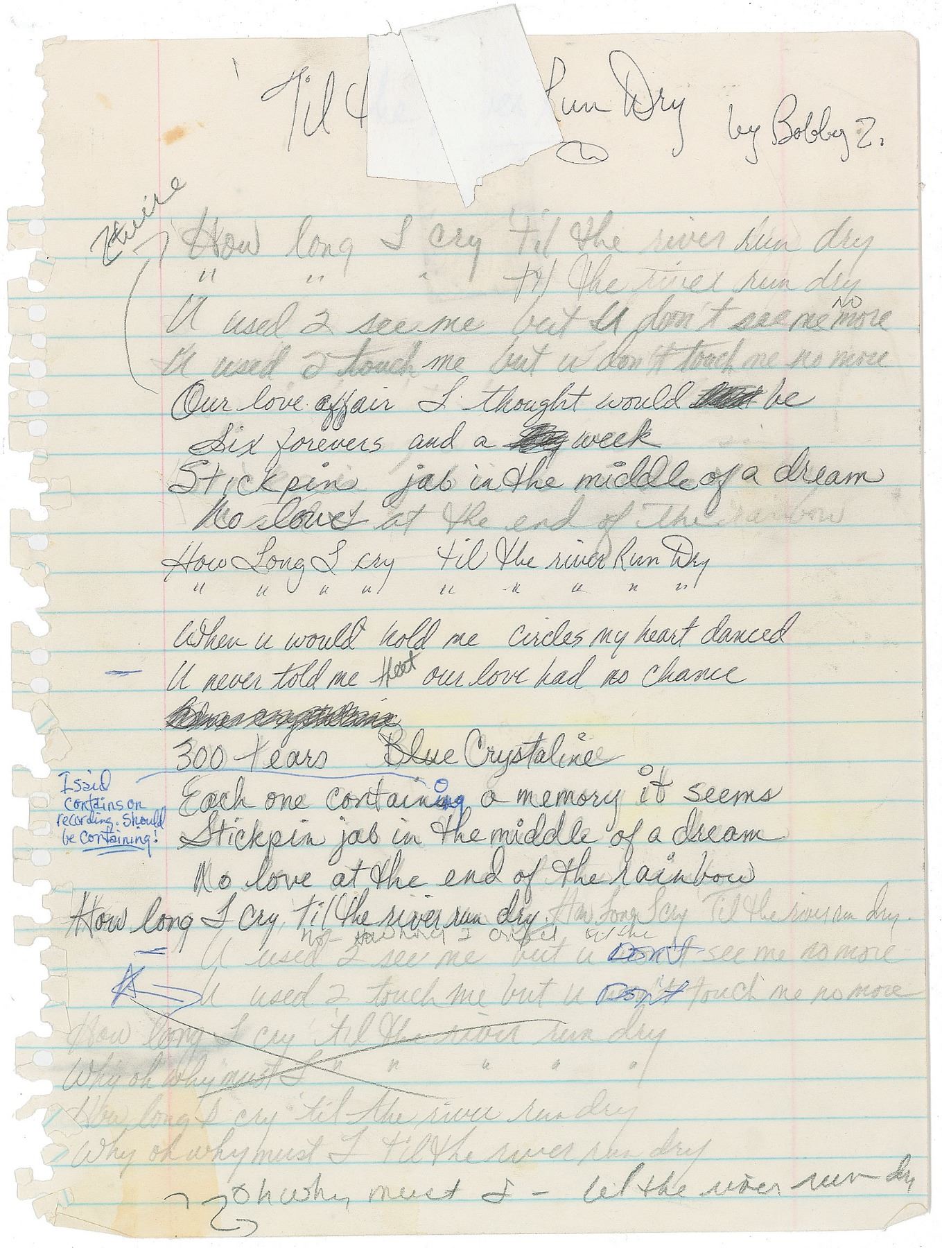 Prince's handwritten draft of the lyrics for "Til the River Run Dry" entirely in his hand, one page, 8 x 10.5, no date but circa 1984. The page begins in pencil and continues in ballpoint, with some of the pencil traced over. The song begins: "How long I cry 'til the river run dry / …til the river run dry / U used 2 see me but u don't see me no more / U used 2 touch me but u don't touch me no more / Our love affair I thought would be / Six forevers and a week / Stickpin hab in the middle of a dream / No love at the end of the rainbow." In very good to fine condition, with some white tape to the top edge obscuring a few words in the title.