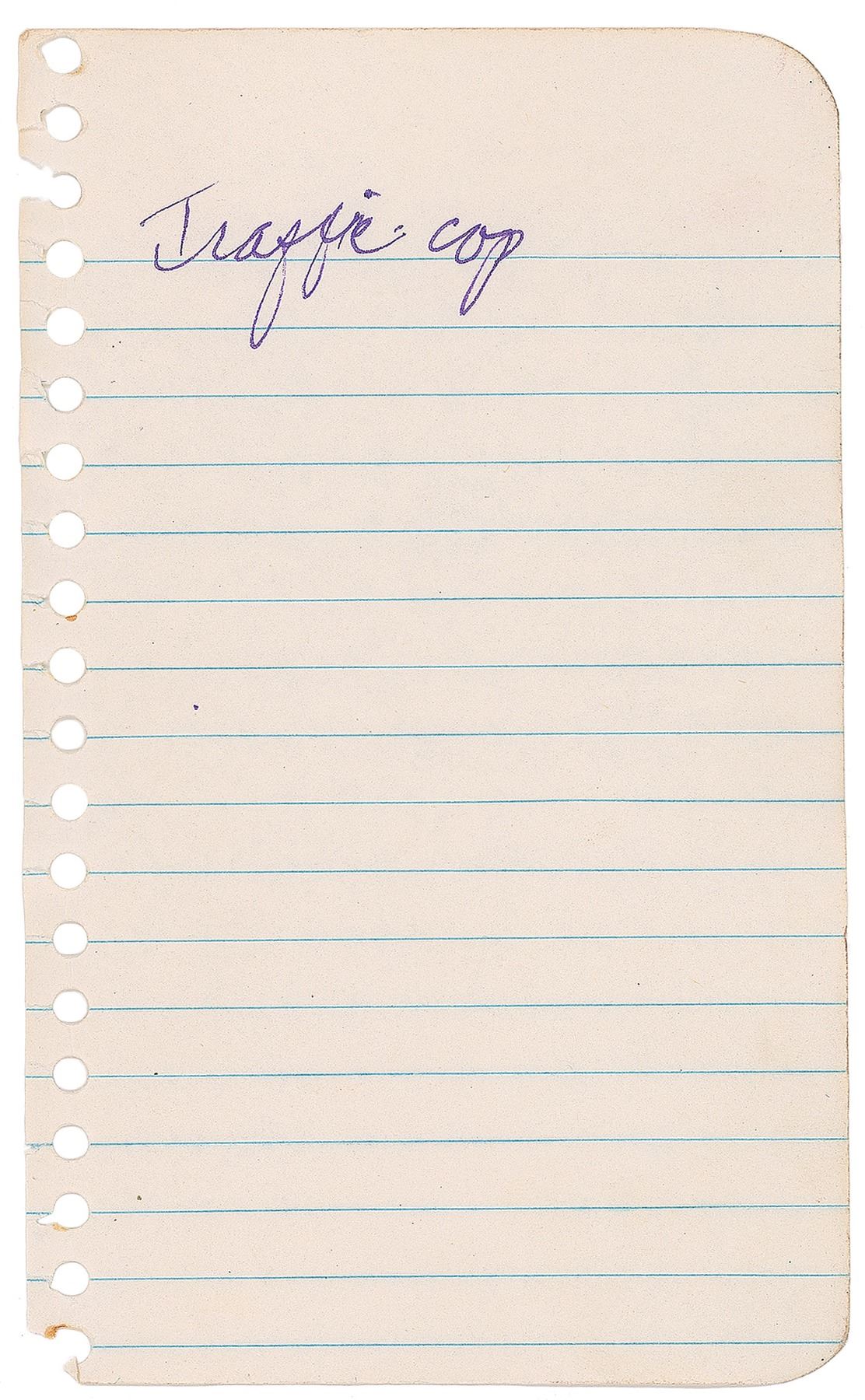 Unsigned handwritten notes by Prince in purple ink on two separate 3 x 5 sheets from a pocket notebook, apparently concerning an idea for a movie scene. One page reads, in full: "Traffic cop in middle of street directing traffic, 'What the fuck can he do, chase me?' Cop pulls out gun, fires one shot (cut to reaction—car), Back to cop putting gun in holster." The second page simply reads, "Traffic cop." In fine condition. From the collection of an early Prince insider.