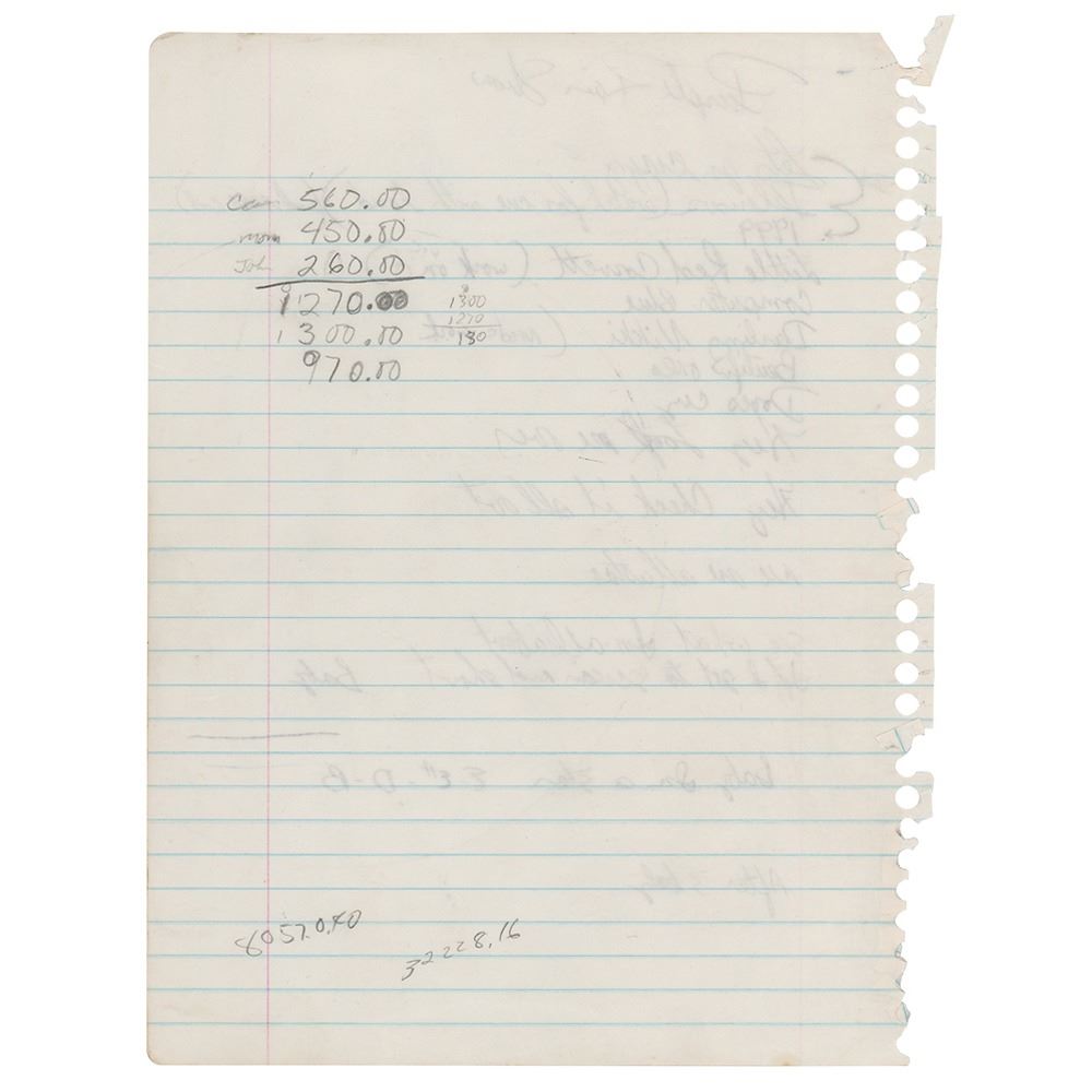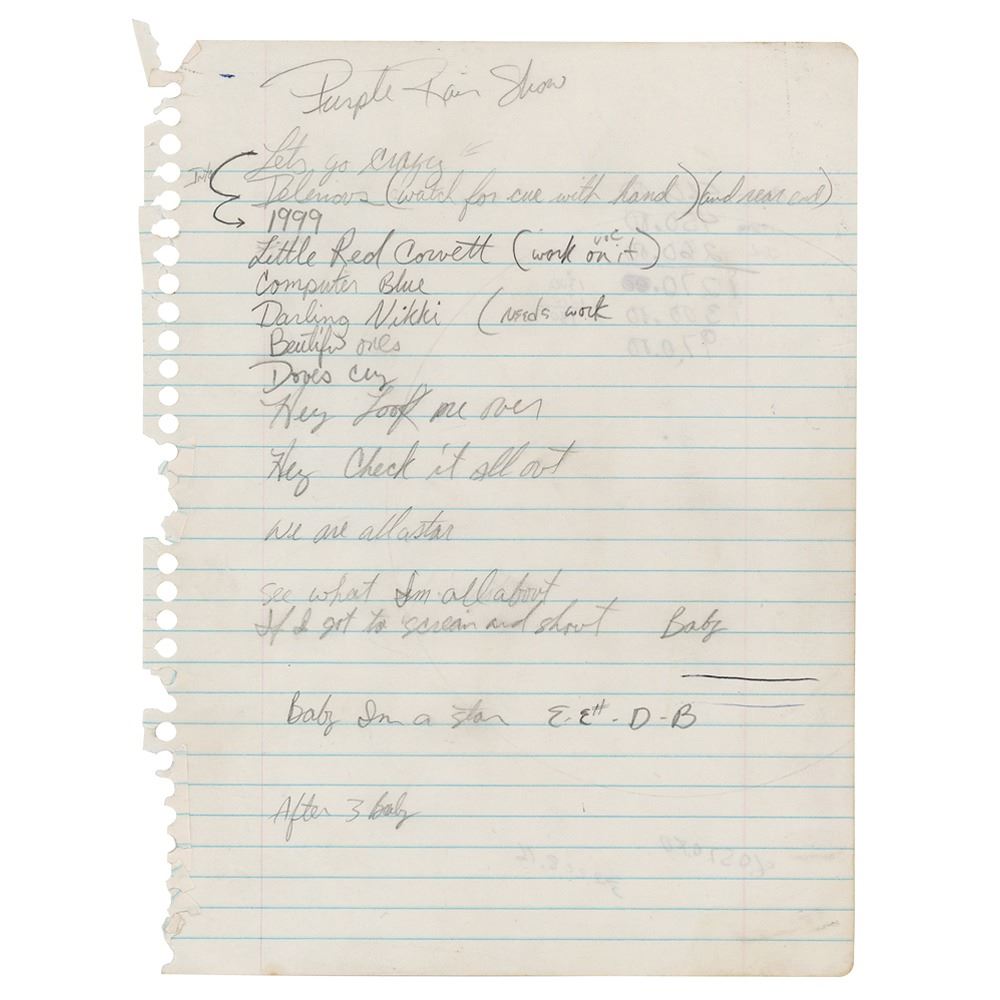 Circa 1984 handwritten set list and song lyrics by Prince, annotated in pencil on an off-white 8 x 10.5 sheet of notebook paper, unsigned and undated, entitled at the top, “Purple Rain Show.” The set list contains a total of eight songs, with Prince adding notes and parentheticals to the right of a few (spelling and grammar retained): “Lets go crazy,” “Delerious (watch for cue wih hand) (and rear end),” “1999,” “Little Red Corvette (work on it, voc),” “Computer Blue,” “Darling Nikki (needs work),” “Beutiful ones,” and “Doves cry.” Below the titles Prince adds lyrics to the song ‘Baby I’m a Star,’ as well as a few chord notes: “Hey Look me over / Hey Check it all out / We are all a star / See what Im all about / If I got to scream and shout Baby / Baby Im a star E - E# - D - B / After 3 baby.” The reverse of the page bears a math equation that appears to be summing up some expenses. In fine condition.