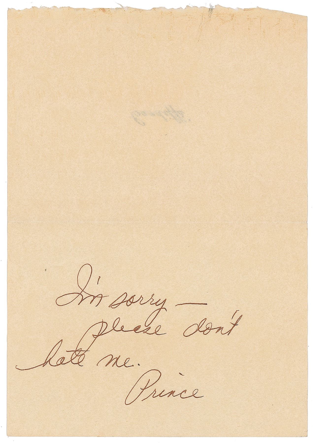 ANS signed “Prince,” one page inside a 4.75 x 3.5 Cardiffs' card, no date. In full: "I'm sorry—please don't hate me. Prince." In fine condition, with some horizontal creases. From the collection of an early Prince insider. The consignor, who lived with Prince in Los Angeles, notes that they were at the Roxy one night and Prince left chasing after a girl, accidentally taking the keys to the car and house with him. He sent flowers with this note the next day, after realizing that he had left her stranded.