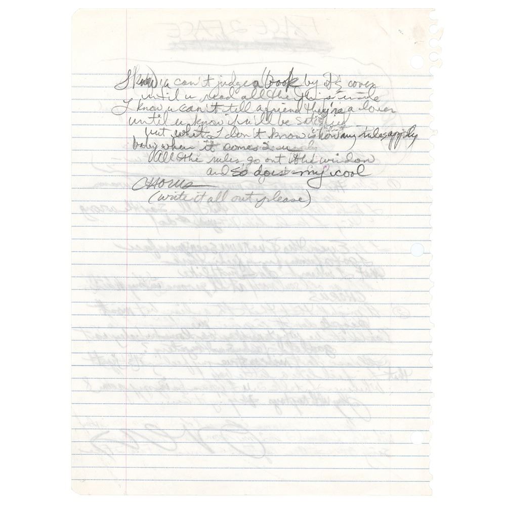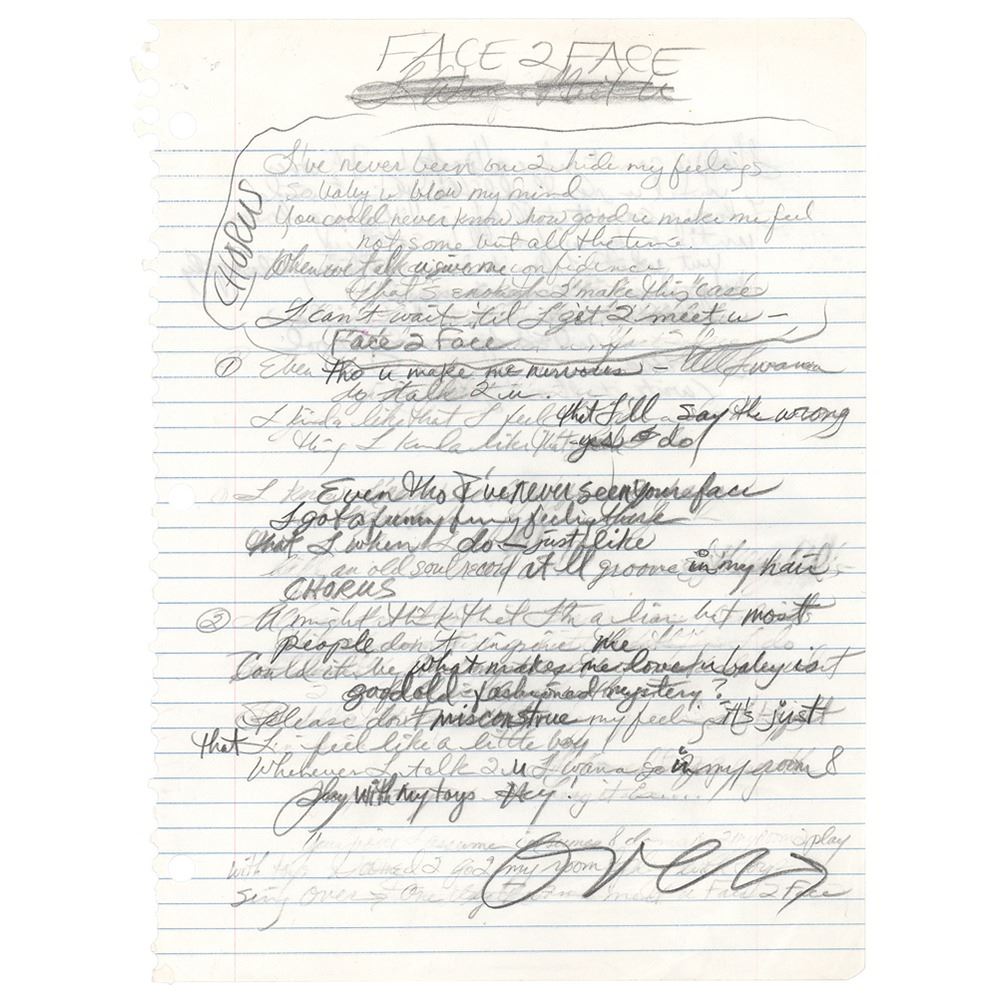 Handwritten working lyrics in pencil for the song ‘Face 2 Face’ by Prince, unsigned, one page, both sides, 8.25 x 11, no date. The lyrics read, in full: “Chorus / I’ve never been one 2 hide my feelings / baby u blow my mind / You could never know how good u make me feel / not some but all the time / When we talk u give me confidence / that’s enough 2 make this case / I can’t wait ‘til I get 2 meet u - / Face 2 Face / 1. Even tho u make me nervous—All I wanna / do talk 2 u / I kinda like that I feel like that I’ll say the wrong thing I kinda like that yes [eye] do / Even tho I’ve never seen your face / I got a funny funny feeling there / that I when I do—just like / an old soul record it’ll groove in my hair / Chorus / 2. U might think that I’m a lion but most / people don’t inspire me / Could it be what make me love u baby is / good old fashioned mystery? / please don’t misconstrue my feelings it’s just / that I feel like a little boy / Whenever I talk 2 u I wanna go in my room & / play with my toys Hey! / Over / I know u can’t judge a book by its cover / until u read all there is inside / I know u can’t tell a friend they’re a lover / until u know if u’ll be satisfied / but what I don’t know is how any rules apply / baby when it comes 2 u / All the rules go out the window / and so does my cool / Chorus (write it all out please).” In fine condition, with some light creasing to the bottom. Research indicates that ‘Face 2 Face’ was ultimately never recorded, although the opening line, “I’ve never been one 2 hide my feelings / baby u blow my mind,” was used in the song ‘Space,’ the second single from Prince’s 1994 album Come.