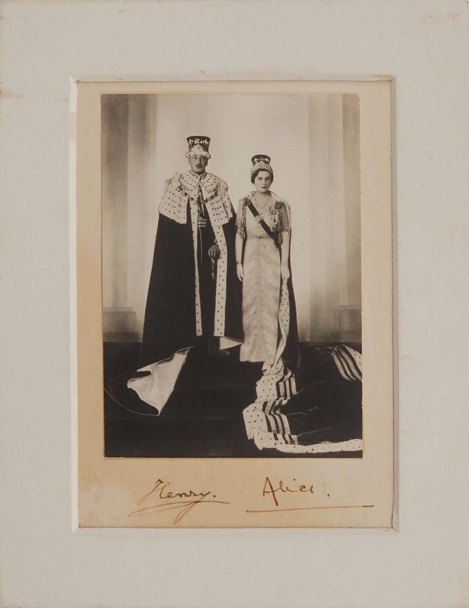 Vintage matte-finish 3.5 x 4.75 full-length portrait of the Duke and Duchess of Gloucester, affixed to its original studio mount, signed on the mount in black ink, “Henry” and “Alice.” Matted to an overall size of 6.25 x 8. In fine condition, with light staining to the mat.