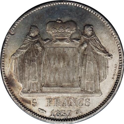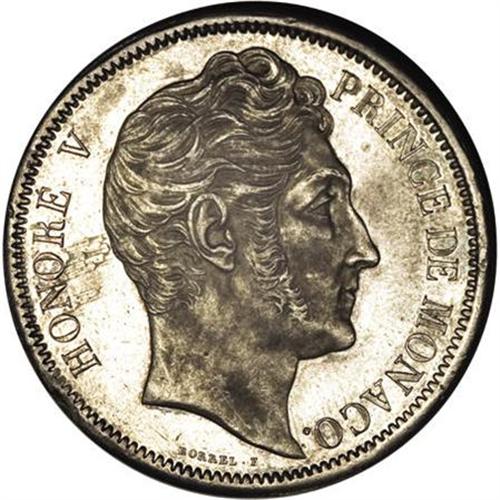 <B>Prince Honore V 5 Francs 1837M, </B></I>KM96, prooflike AU-UNC, lightly toned with one small planchet lamination in the left obverse field. An exceptionally attractive example of this classic type.<BR><I>From the Monedas Oro Collection</B></I><BR><BR><b>Shipping:</b> Coin/Currency (<a target="_blank" href="http://www.heritageauctions.com/common/shipping.php">view shipping information</a>)