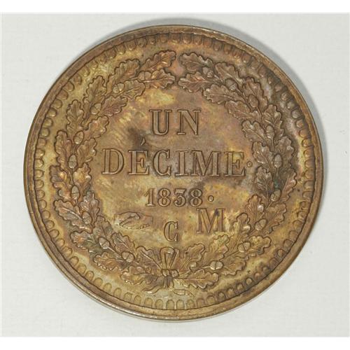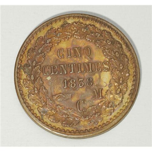 <B>Prince Honore V - Pair of Brass Patterns, </B></I>KM-Pn3 5 Centimes 1838, AU, unevenly toned, and KM-Pn5 Decime 1838, AU with considerable mint luster. These patterns are also listed in a copper and tin alloy, KM-Pn4 and Pn6, which could be the brassy appearance of this pair.<BR><I>From the Louis E. Eliasberg, Sr. Collection</B></I><BR><BR><b>Shipping:</b> Coin/Currency (<a target="_blank" href="http://www.heritageauctions.com/common/shipping.php">view shipping information</a>)