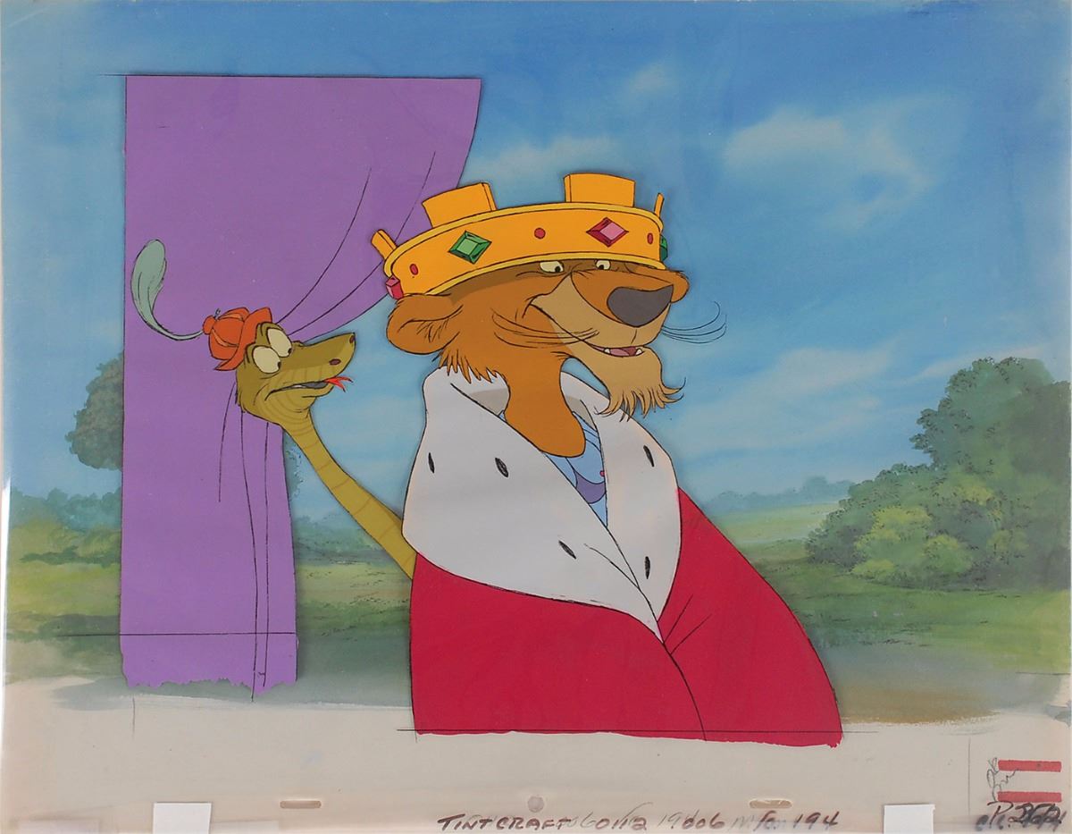 (Walt Disney Studios, 1973) Original production cel and master background set-up featuring Prince John and Sir Hiss from The Jungle Book. The cel is placed on a hand-painted production master background. Image measures 10.5 x 9.75, with overall dimensions of 16 x 12.5. In fine condition. A beautiful set-up with large characters and vibrant colors.