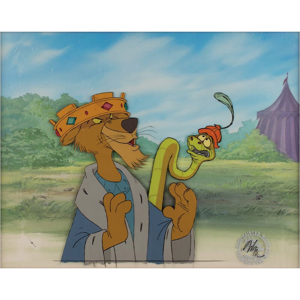 (Walt Disney Studios, 1973) Original production cels of Prince John and Sir Hiss from Robin Hood, which are placed on a beautiful hand-painted production background from the same film: the set-up depicts the two villainous characters in large half-length poses against a backdrop of the open fairgrounds where the archery tournament is held. Lower border of background is marked in pencil: "0112, .006, Sc. 634 and 636, Mimi." Total character image measures 8.25 x 7.75, with a mat opening of 13.5 x 10.5. Matted to an overall size of 20 x 16. The piece has the silver Walt Disney Productions seal to lower right. In fine condition, with the lower right corner tip of background neatly clipped.