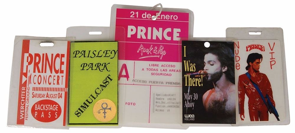 Five laminated concert passes for various Prince shows, including: a backstage pass for the Werchter Festival Ground, August 4, 1990; an “I Was There!” passs for the Ahoy, Rotterdam, May 30; a green “Paisley Park Simulcast” pass; a VIP pass for the 1990 Nude Tour; and a pass for the “Rock & Pop” show in Buenos Aires on January 21, 1991. In fine condition. From the collection of costume designer Helen Hiatt.