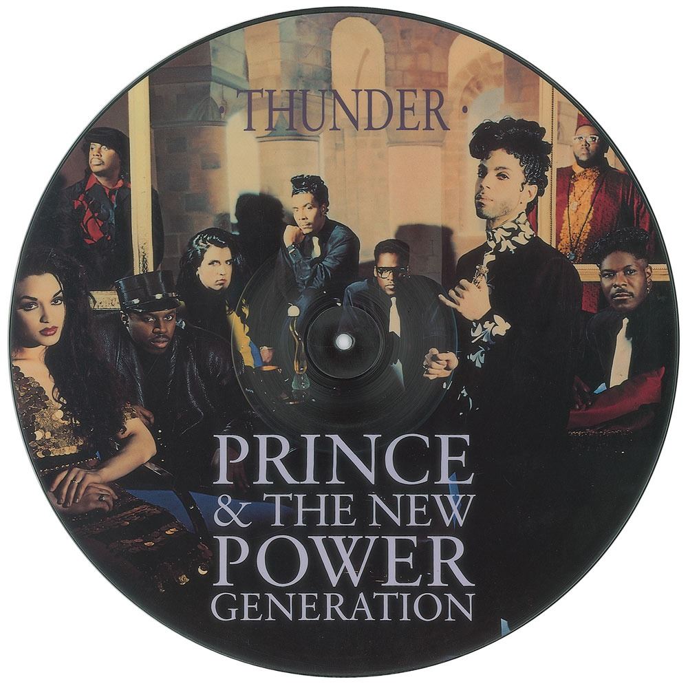 Limited edition picture disc for the Prince and the New Power Generation single ‘Thunder / Violet the Organ Grinder / Gett Off (Thrust Dub),’ numbered 10375, includes the original backing. In fine condition, with creasing to upper right of backing.