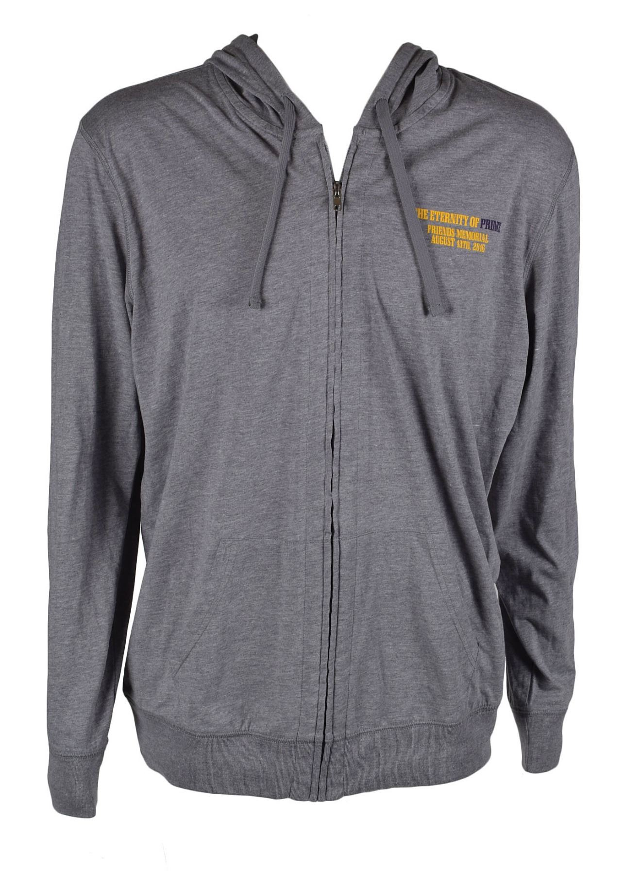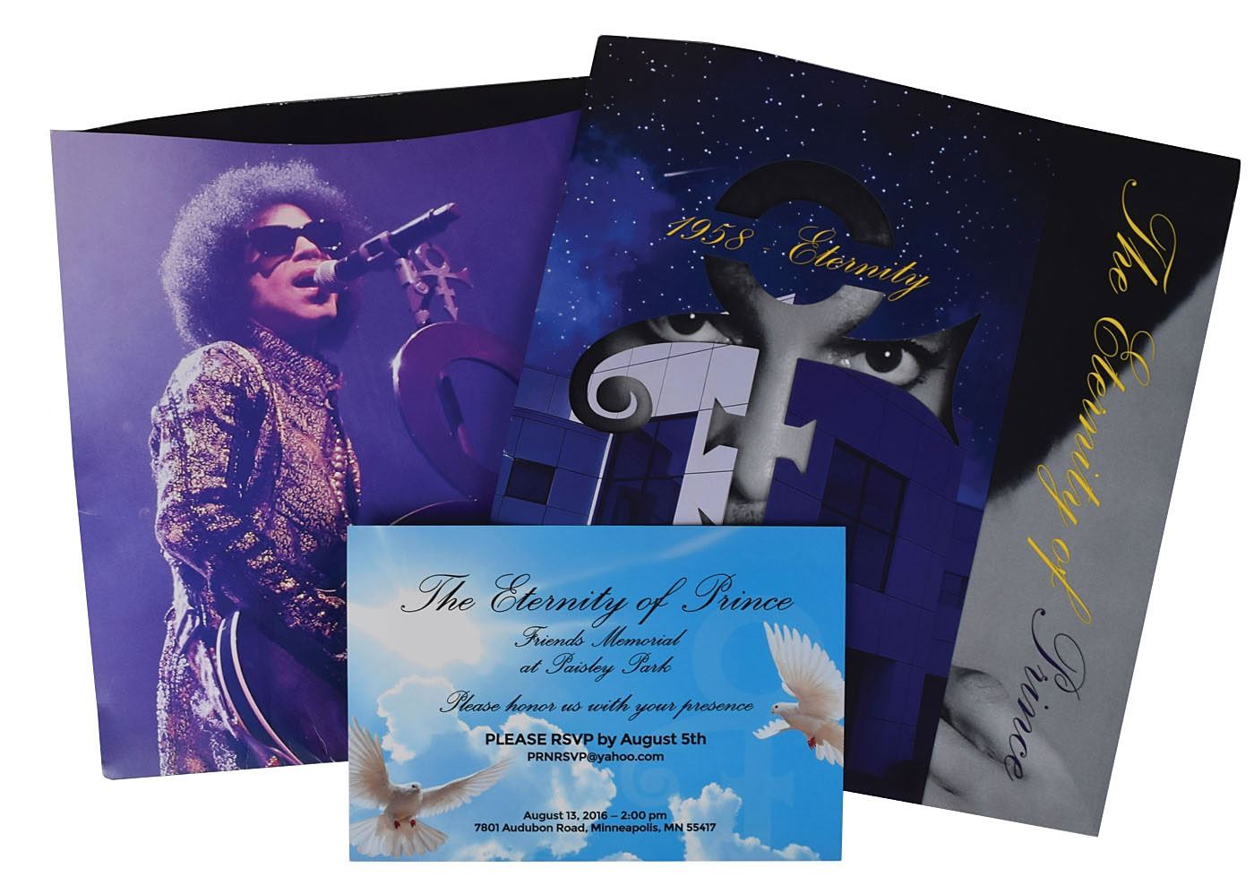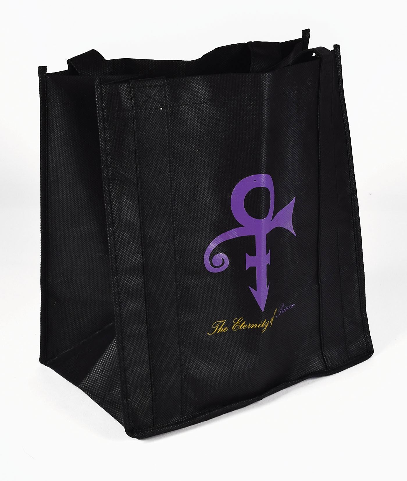 Gift bag presented to those in attendance at the official, invitation-only Prince Memorial Service at Paisley Park on August 13, 2016, an event known as “The Eternity of Prince.” Includes: the black gift bag, emblazoned with a purple Prince symbol and “The Eternity of Prince”; a handsome program with many color images of Prince; a white t-shirt, size XL, with purple foil design on the front, and “#shelbyj” and “#astarisborn” on the sleeves; a light gray zippered hoodie, size XL, with “The Eternity of Prince, Friends Memorial, August 13, 2016” on the front, and a “Way Back Home, 1958–Eternity” graphic on the back; a silver-colored Prince symbol pendant on a chain in a small black drawstring pouch with the same symbol, embroidered on the reverse, “1958–Eternity”; and a laminated access pass that reads “The Eternity of Prince – Honored Friend – Thank U 4 Loving Prince,” on a custom “Eternity of Prince” lanyard. The back of the pass reads, “No one will be admitted without an invitation. No photos, video or recording of any kind inside Paisley Park.” In overall fine condition.