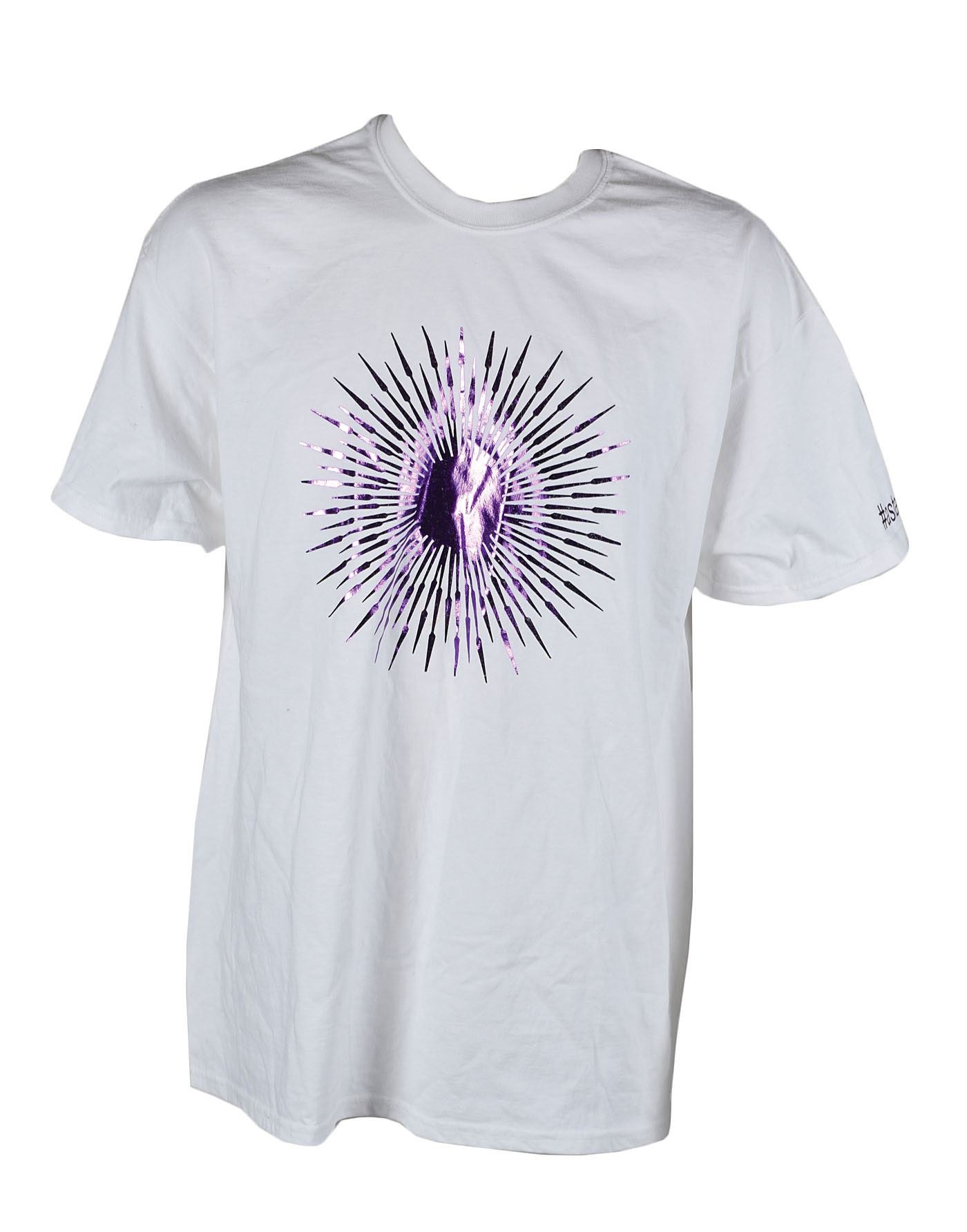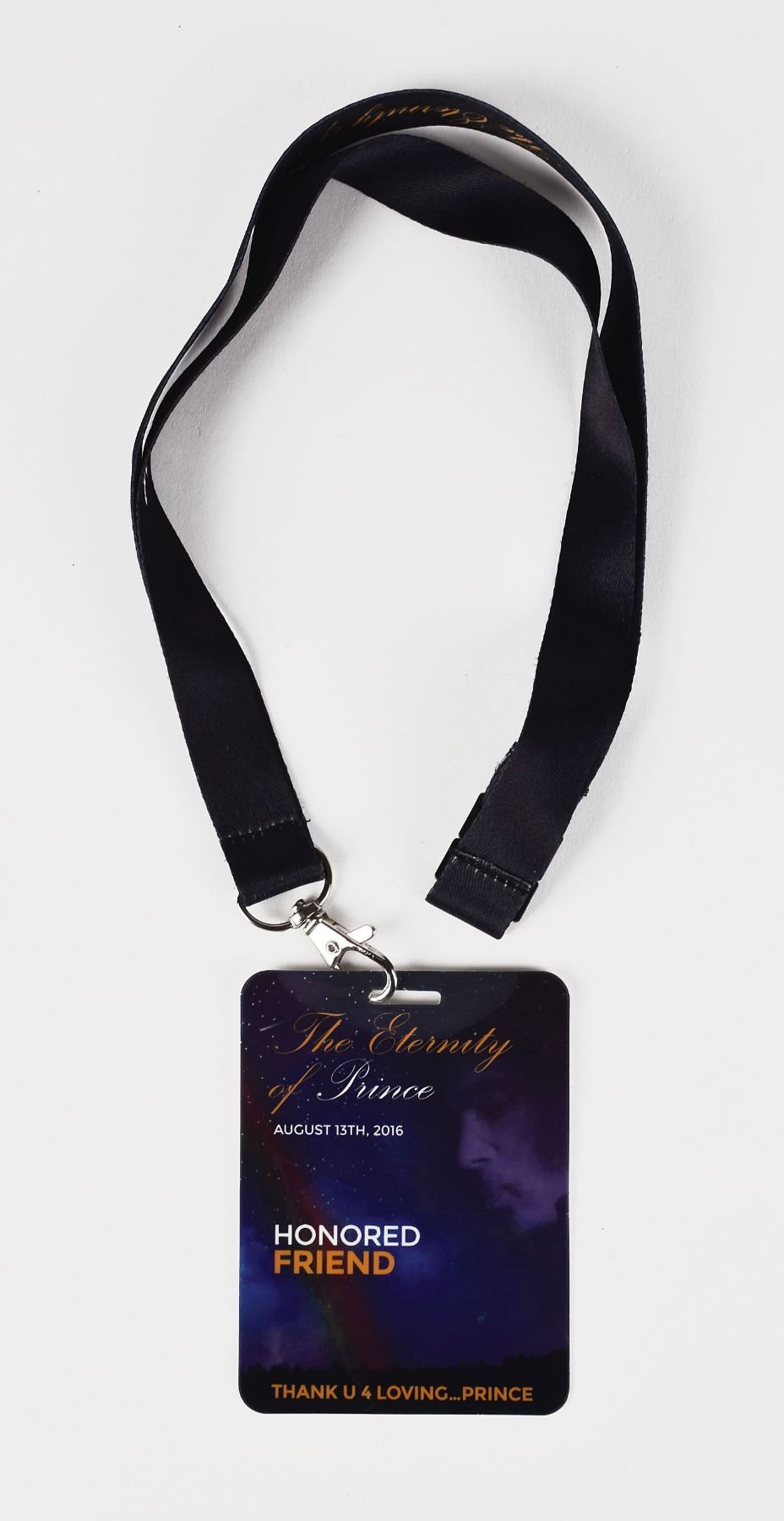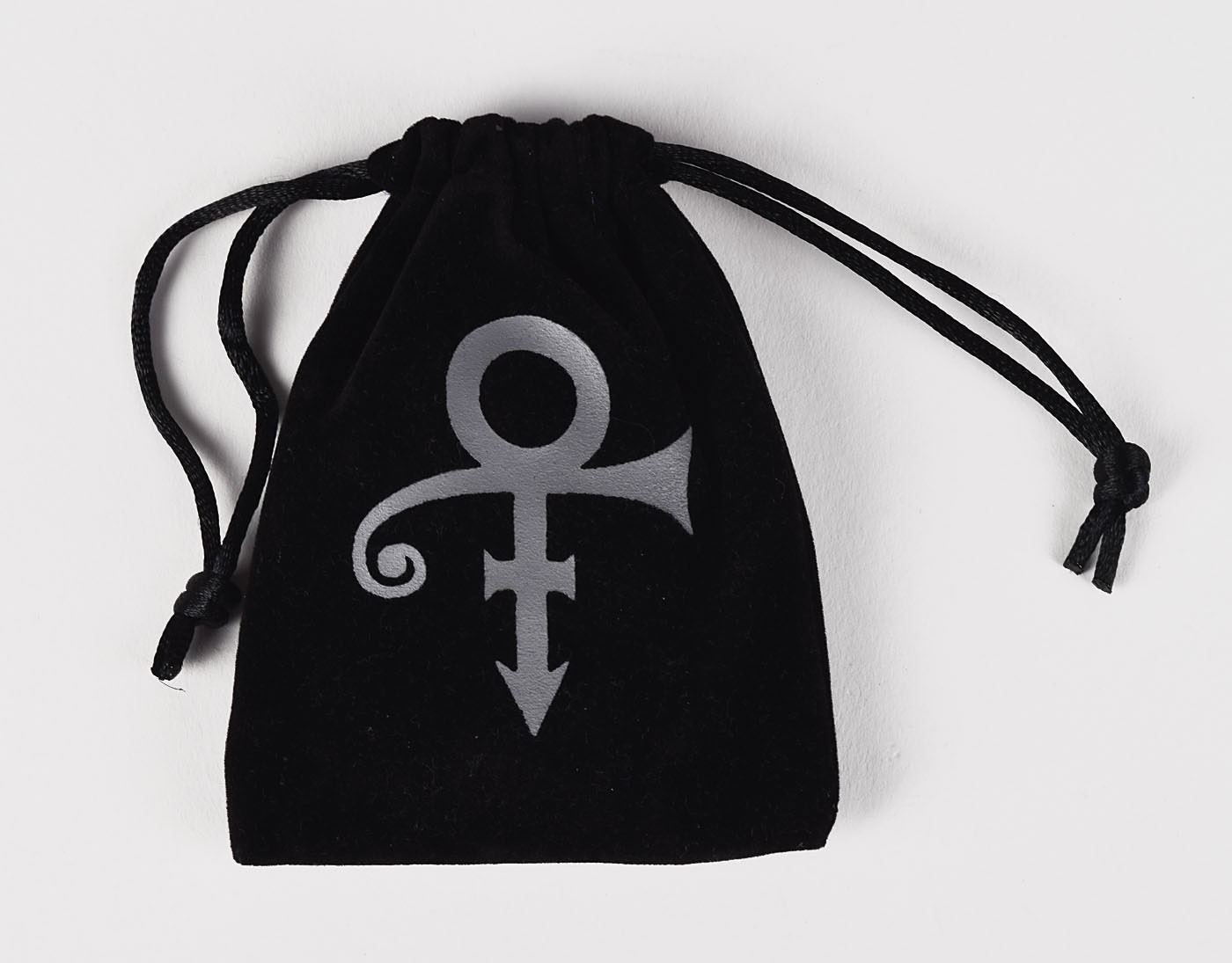Gift bag presented to those in attendance at the official, invitation-only Prince Memorial Service at Paisley Park on August 13, 2016, an event known as “The Eternity of Prince.” Includes: the black gift bag, emblazoned with a purple Prince symbol and “The Eternity of Prince”; a handsome program with many color images of Prince; a white t-shirt, size XL, with purple foil design on the front, and “#shelbyj” and “#astarisborn” on the sleeves; a light gray zippered hoodie, size XL, with “The Eternity of Prince, Friends Memorial, August 13, 2016” on the front, and a “Way Back Home, 1958–Eternity” graphic on the back; a silver-colored Prince symbol pendant on a chain in a small black drawstring pouch with the same symbol, embroidered on the reverse, “1958–Eternity”; and a laminated access pass that reads “The Eternity of Prince – Honored Friend – Thank U 4 Loving Prince,” on a custom “Eternity of Prince” lanyard. The back of the pass reads, “No one will be admitted without an invitation. No photos, video or recording of any kind inside Paisley Park.” In overall fine condition.