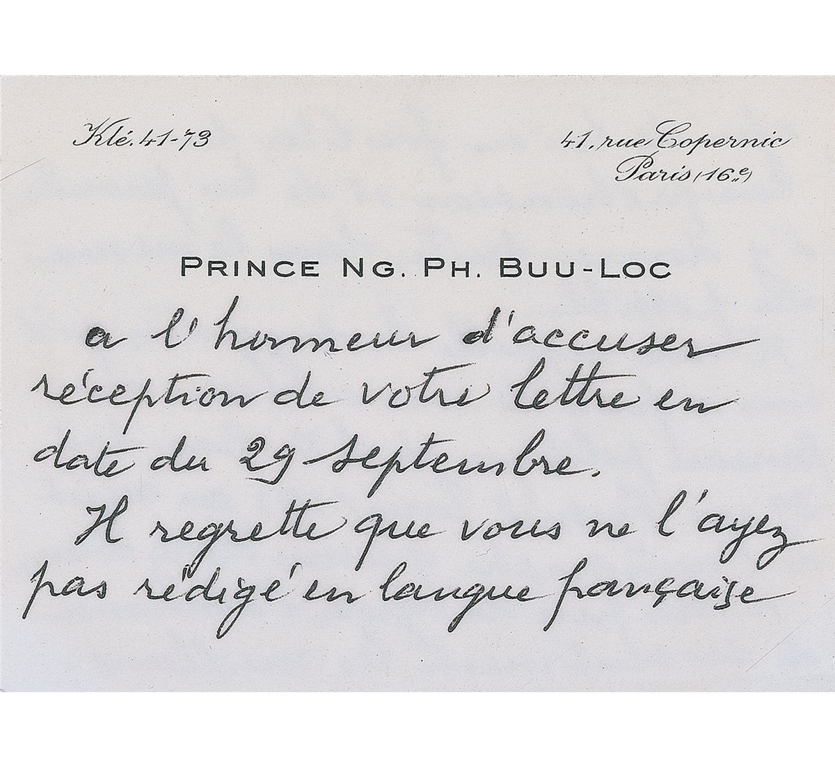 Cousin of emperor Bao Dai who served as prime minister in 1954 (1914–1990). Handwritten note in French on both sides of a 3.75 x 2.75 personal compliment card, signed on a second identical card, “Buu Loc.” In overall fine condition, with trivial surface loss to top edge of the signed card due to previous mounting.