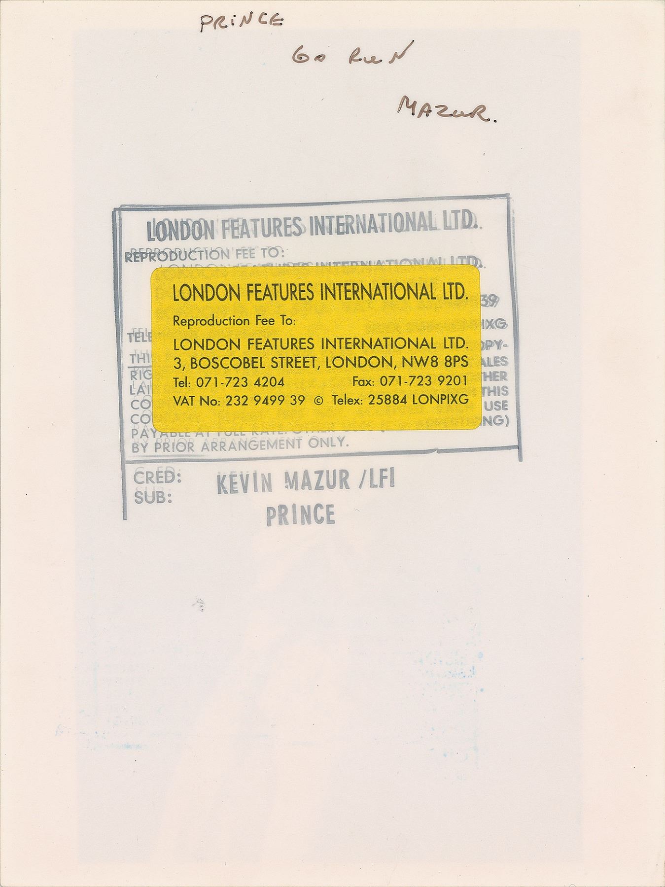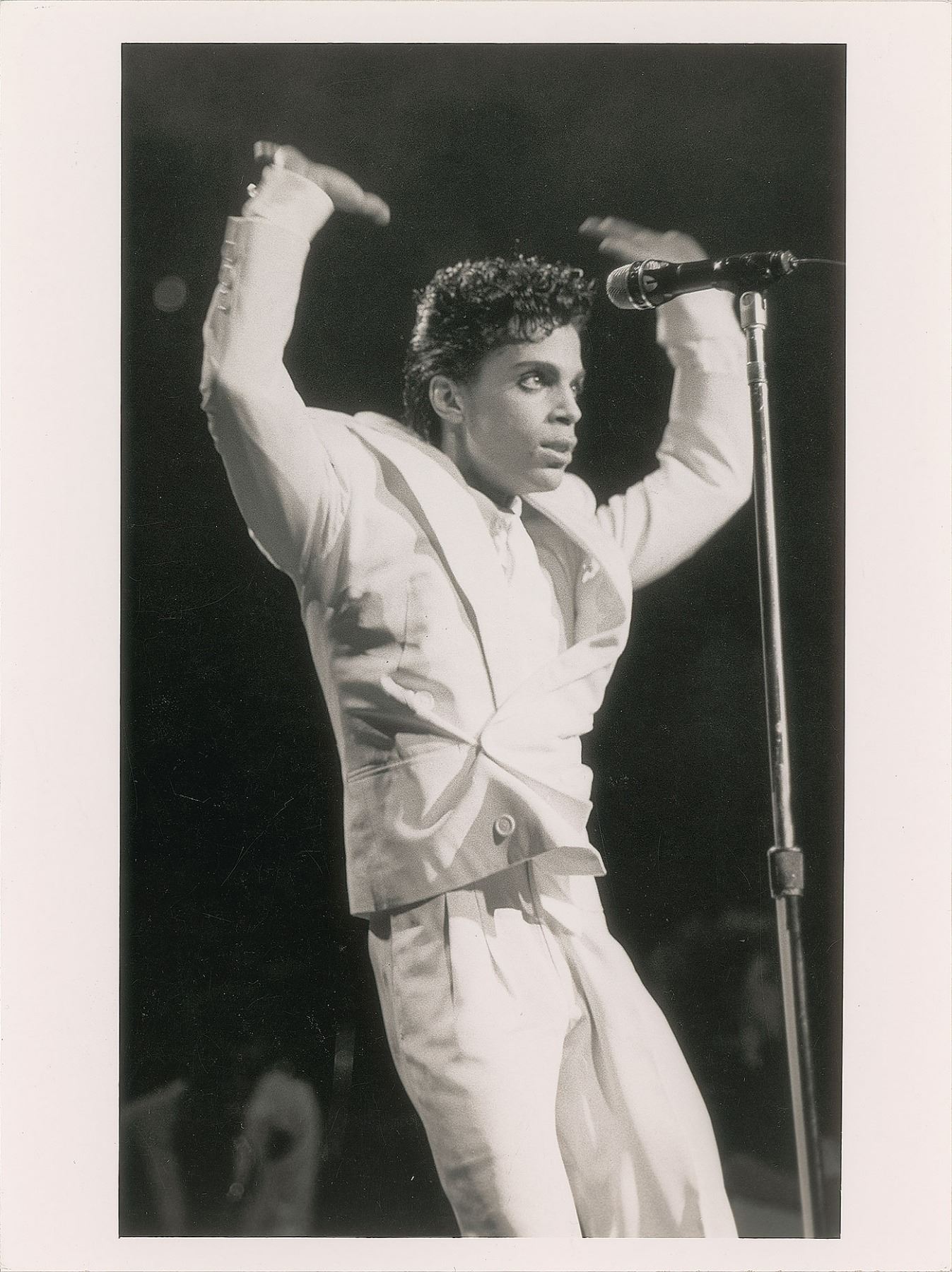 Original vintage glossy 6 x 8 silver gelatin photo of Prince doing an energetic dance move in a white suit. Reverse bears a Kevin Mazur/London Features International Ltd. credit stamp. In fine condition. From the Globe Photo archives.