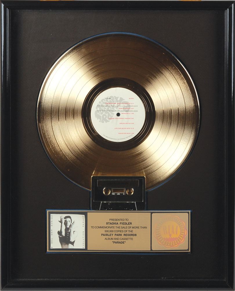 Official RIAA flower hologram-style gold sales award presented "to Stachia Fiedler to commemorate the sale of more than 500,000 copies of the Paisley Park Records album and cassette 'Parade.'" Framed with its disc, cassette, and plate bearing a small image of the album cover to an overall size of 17 x 21. Award retains its original backing with a Fitzgerald Hartley Marketing label. In fine condition. From the collection of Prince's assistant Stachia Fiedler.