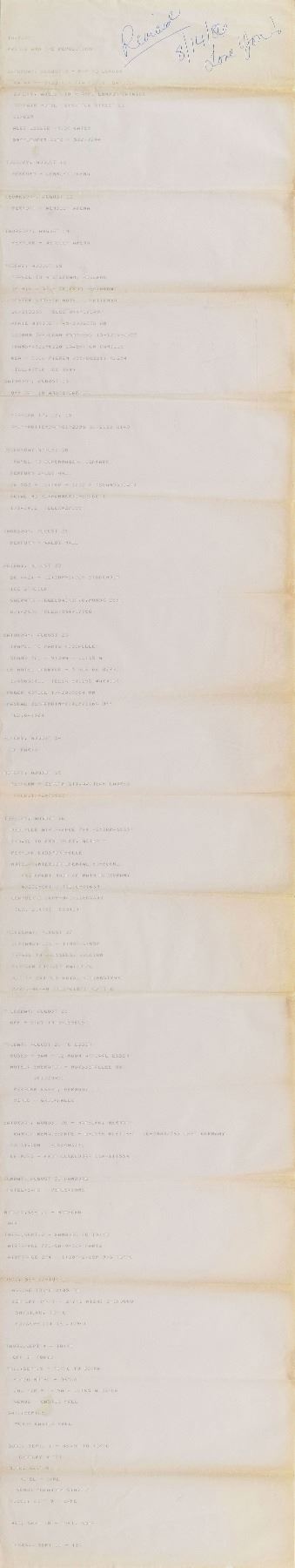 PRN Productions itinerary for Prince’s 1986 Parade Tour, four total pages, 8.5 x 11, dated August 9 to September 11, 1986. The first two pages are photocopies and are marked with pink and purple highlighter; the third page (front and back) is original and bears copious handwritten notes in blue and black ink. The itinerary chronicles the entirety of the European and Asian legs of the Parade tour, starting with a flight from Minneapolis to London on August 9th for Prince’s three legendary shows at Wembley Arena, and concluding with a “To Be Announced” concert in Tokyo, Japan, on September 11th. The pages are dense with phone numbers and detailed notations that list the contacts, hotels, venues, times, and travel arrangements for the trip. Also includes a dot matrix printout for the entire European and Asian Parade Tour itinerary. In fine condition, with expected wear from use. From the collection of Prince’s former assistant, who served as road manager during this tour, and accompanied by a letter of provenance.