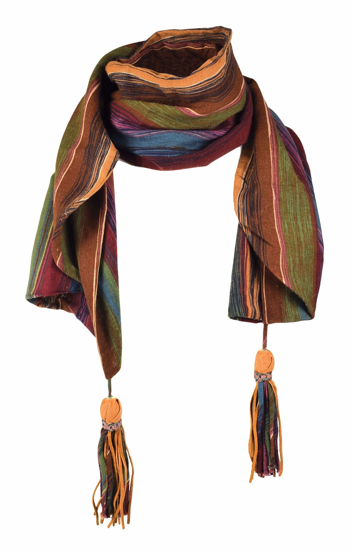 Prince's personally-owned and -worn scarf featuring a colorful pattern of maroon, green, brown, blue, and purple, measuring an overall 61 x 18.5, featuring ornate tassels at each end. In fine condition. From the collection of an early Prince insider. Accompanied by a color 4.5 x 3.5 photo showing Prince wearing this scarf at a Hertz rental car counter, the tassels seen dangling below his vest. A highly desirable piece of Prince's early wardrobe that embodies his stylish flair.