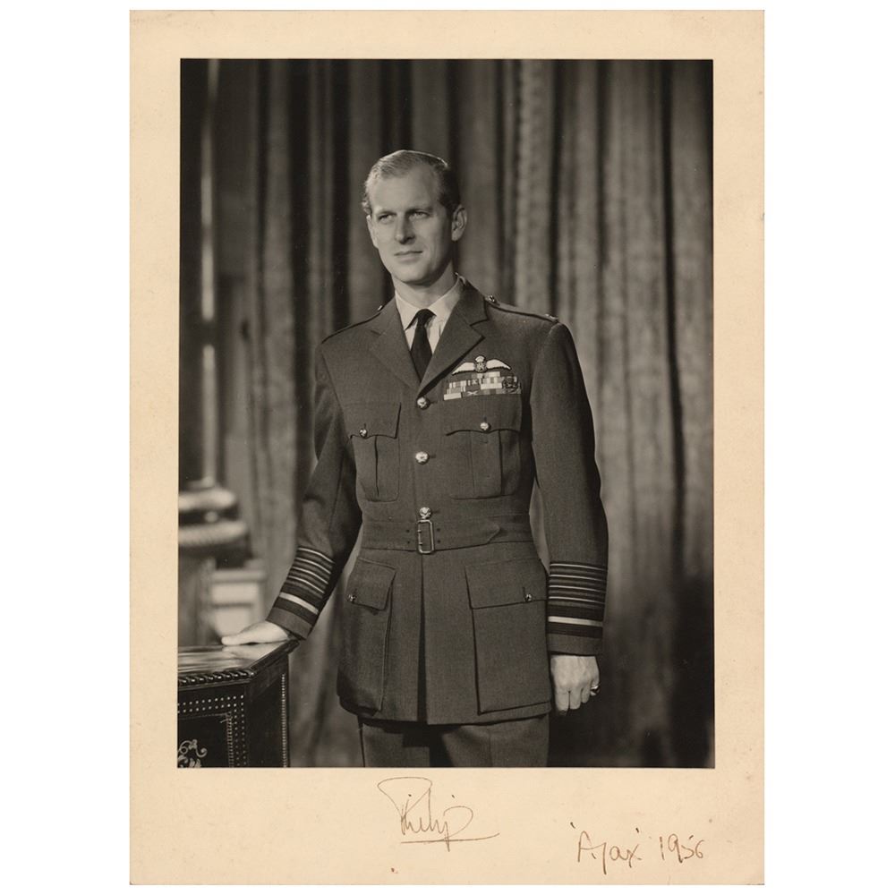 Handsome vintage matte-finish 6 x 8 portrait of Prince Philip in uniform, affixed to its original 7 x 9.75 mount, signed on the mount in fountain pen, "Philip, 'Ajax' 1956." In fine condition.