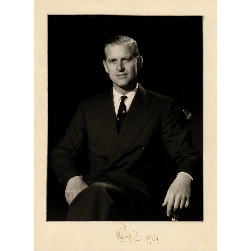Handsome vintage matte-finish 6 x 8 photo of Prince Philip seated in a chair and staring warmly into the camera, affixed to the original 7 x 9.75 mount, which is signed in black ink, "Philip, 1959." In fine condition.