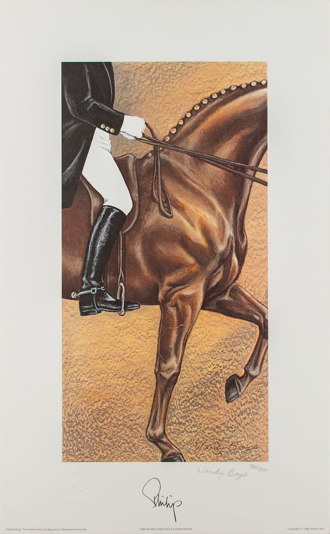 Limited edition color 13.25 x 21.5 print of a 1986 work by Wendy Bays honoring the '1986 World Dressage Championship,' numbered 39/350, signed in the lower border in black ink, "Philip." The print is also signed by the artist in pencil. In fine condition.