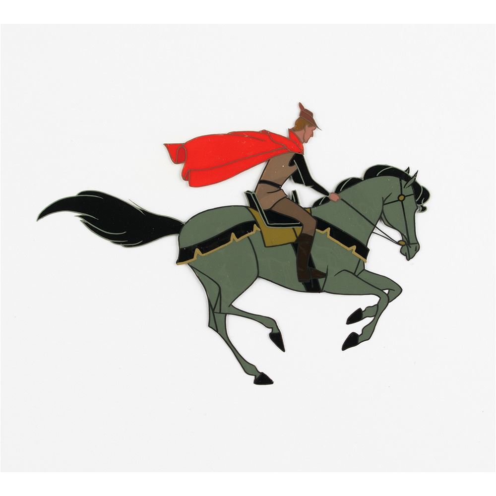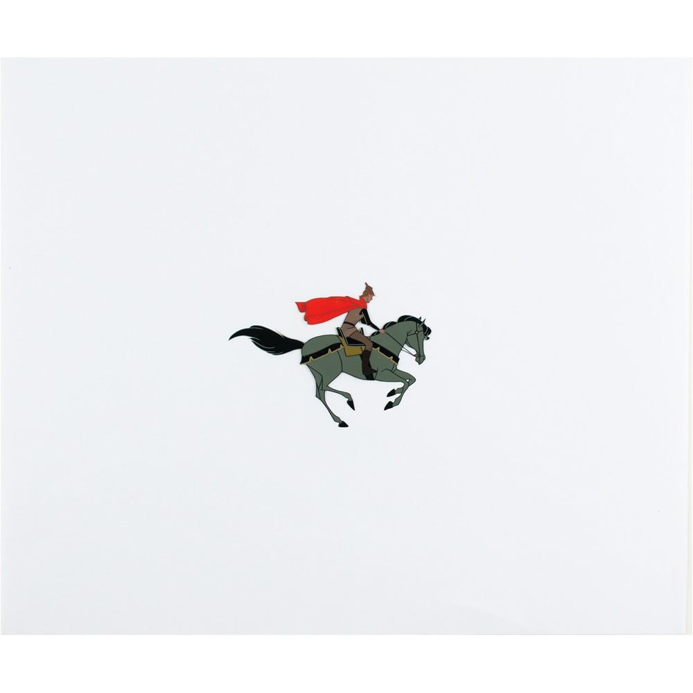 (Walt Disney Studios, 1959) Original production cel of Prince Phillip and Samson from Sleeping Beauty, which shows the film's hero riding atop his faithful steed in a small full-length pose. Image measures 3.75 x 2.75, with overall dimensions of 13.5 x 12.5. In fine condition.