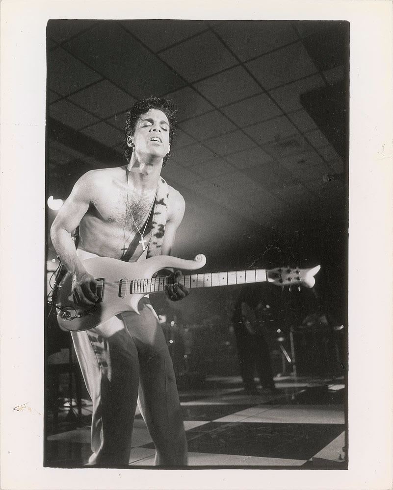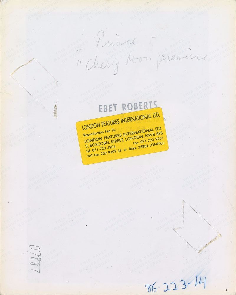 Original vintage glossy 8 x 10 silver gelatin photo of the shirtless Prince playing his uniquely designed guitar. Reverse is annotated in pencil, “Cherry Moon Premiere,” and bears an Ebet Roberts credit stamp and London Features International Ltd. label. In fine condition.