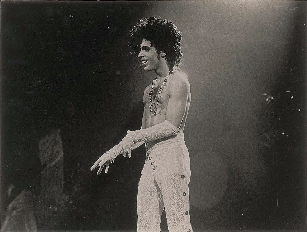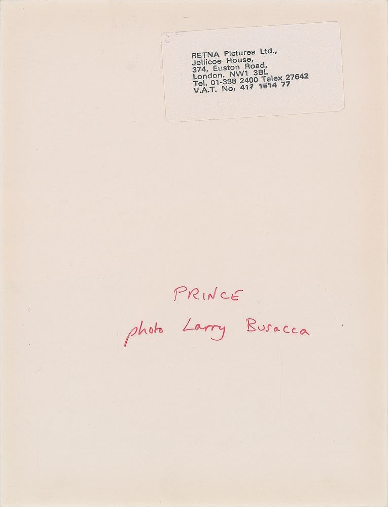 Original vintage glossy 10 x 7.5 silver gelatin photo of the shirtless Prince wearing lacy gloves and pants. Reverse bears a Retna Pictures Ltd. credit label. In fine condition, with trimmed edges.