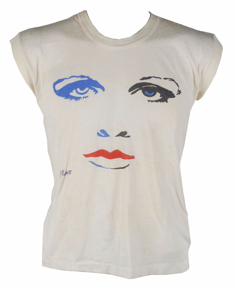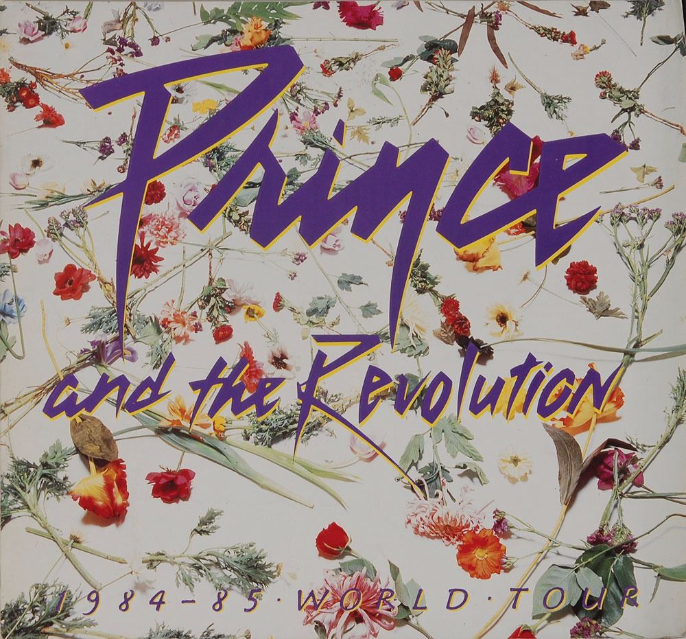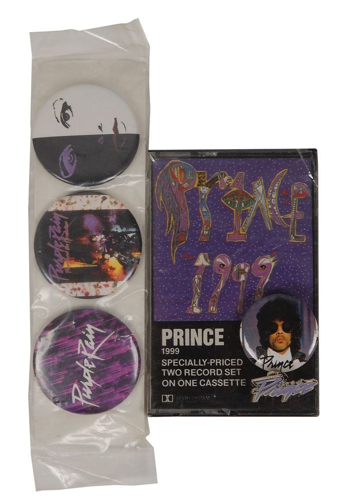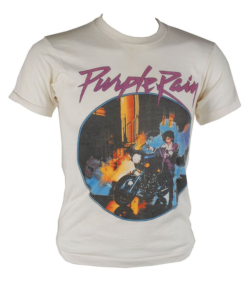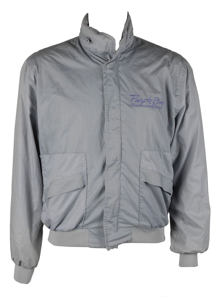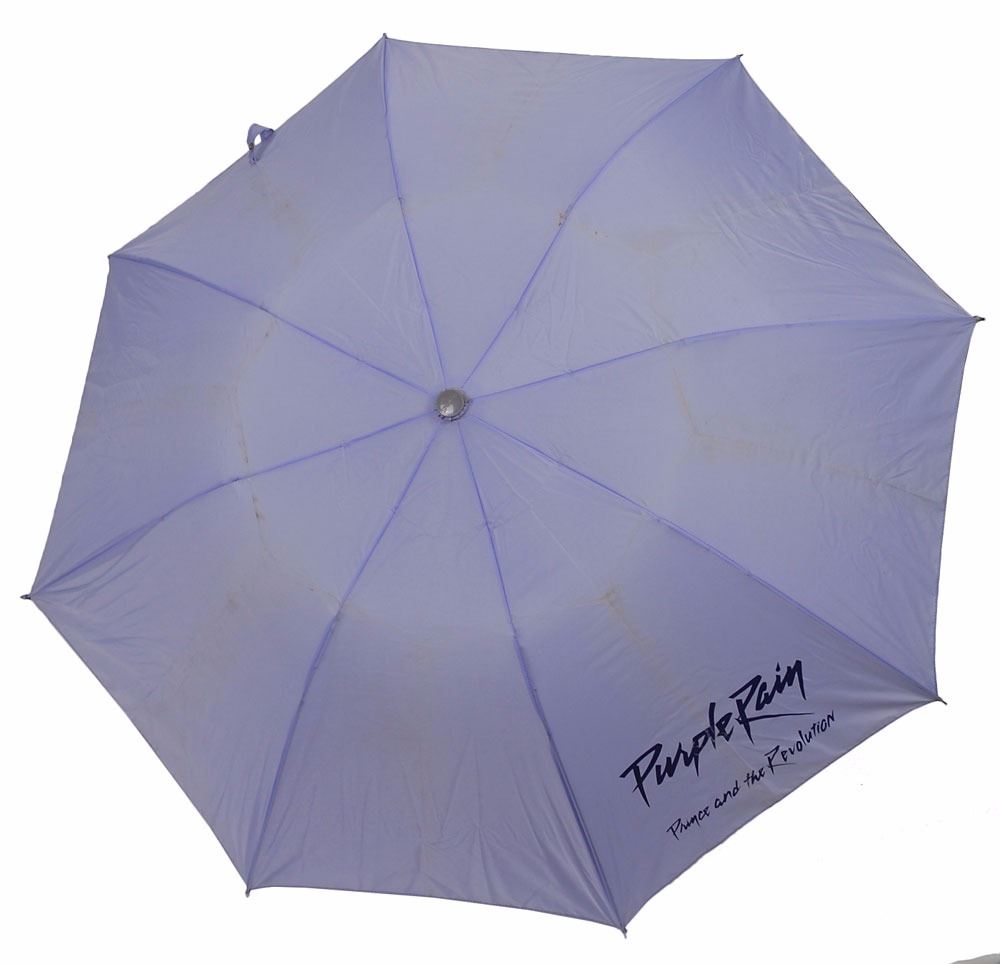 Collection of nine Purple Rain era items, including: a rare Purple Rain promo umbrella, measuring 36? across when open; a gray tour jacket embroidered in purple thread on the left breast, "Purple Rain, Prince and the Revolution"; a set of three promo pins sealed in their original plastic; a promo Prince head shot pin; a purple metal "Prince" pin; a Prince 1999 cassette tape; a Prince and the Revolution 1984-1985 tour book; a Purple Rain t-shirt depicting Prince on a motorcycle; and a Prince and the Revolution muscle shirt. In overall very good to fine condition. From the collection of Prince's assistant Stachia Fiedler.