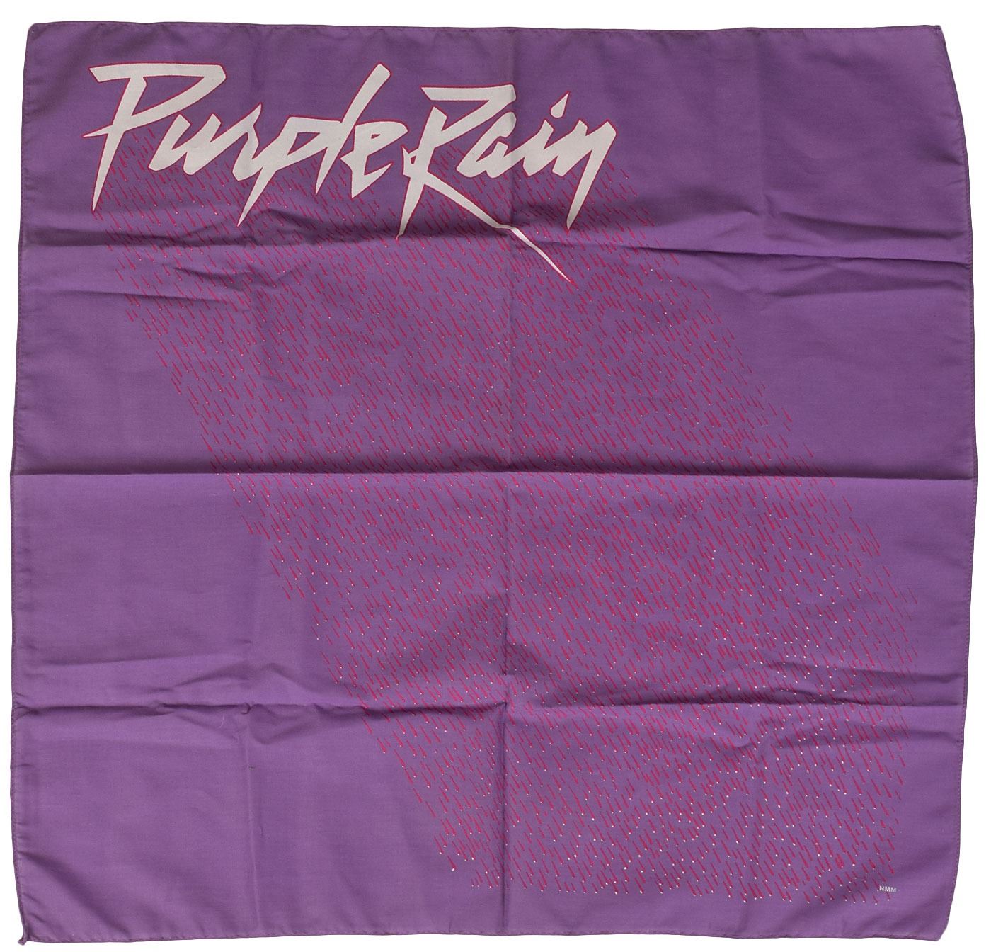 Collection of three items from the 1984–85 Purple Rain Tour, including: a purple 21 x 21 "Purple Rain" bandanna; a 1?-long pin with "Prince" in purple text; and a laminated backstage pass badge with white text reading, "Prince and the Revolution, Purple Rain Tour, '84–'85, Staff, Access All Areas," depicting the staff member on the reverse. In overall fine condition. From the collection of an early Prince insider.