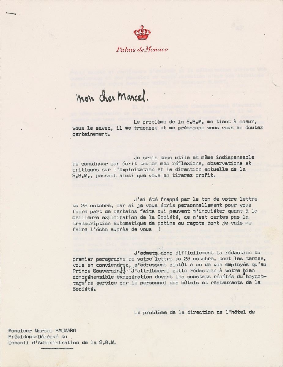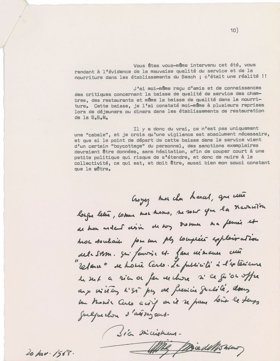 TLS in French, signed “Rainier Prince de Monaco,” ten pages, 8 x 10.5, November 20, 1968. Untranslated letter to Marcel Palmaro featuring a lengthy handwritten postscript at the conclusion. In fine condition. Palmaro was the head of the Monaco company SBM, owner and operator of most of Monaco's attractions, and of which Prince Rainier was the principal shareholder. Rainier offers input on many issues facing the company, hence the length of the letter.