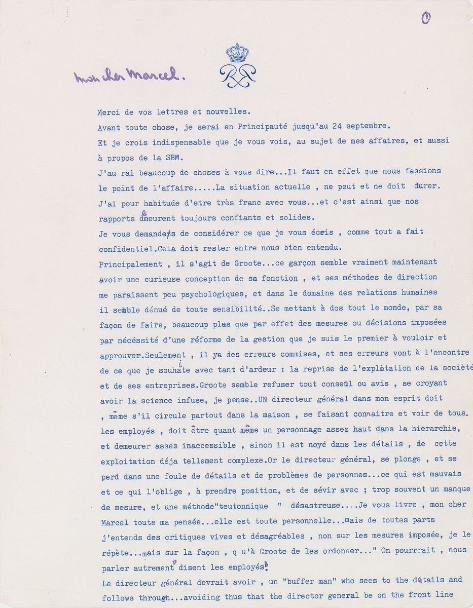 TLS in French and English, signed “Rainier P. de Monaco,” five pages, 8.25 x 10.5, personal letterhead, September 11, 1968. Letter to Marcel Palmaro, head of the Monaco company SBM. In part: “Barelli. As you know I am a fervent supporter, and protector of this excellent orchestra, that the clientele loves and appreciates. I know you like the band also. But it seems that Groote has other ideas, and is trying to kill the renewal of Barelli’s contract…If we lose Barelli, it is a catastrophe he is the backbone and the ‘base’ of all your entertainment, and he must be kept on…You need Barelli’s orchestra, and you do not need other orchestras. My God you yourself experienced this summer the dreadful quality of the orchestras that were engaged by the directeur general!…For the Sea Club you need a small ‘young’ formation of very modern dance music you can get these formations cheap and only take them for two weeks. But you do not need South American music, that we all have heard too much!” Rainier makes several handwritten corrections and emendations throughout. In fine condition, with light creasing and a few tiny tears (primarily along the right edge). Prince Rainier was the principal shareholder of SBM, which owned and operated most of Monaco’s attractions.