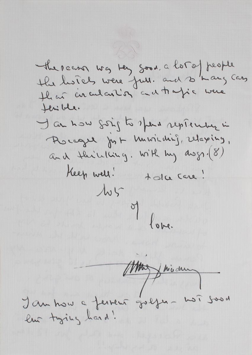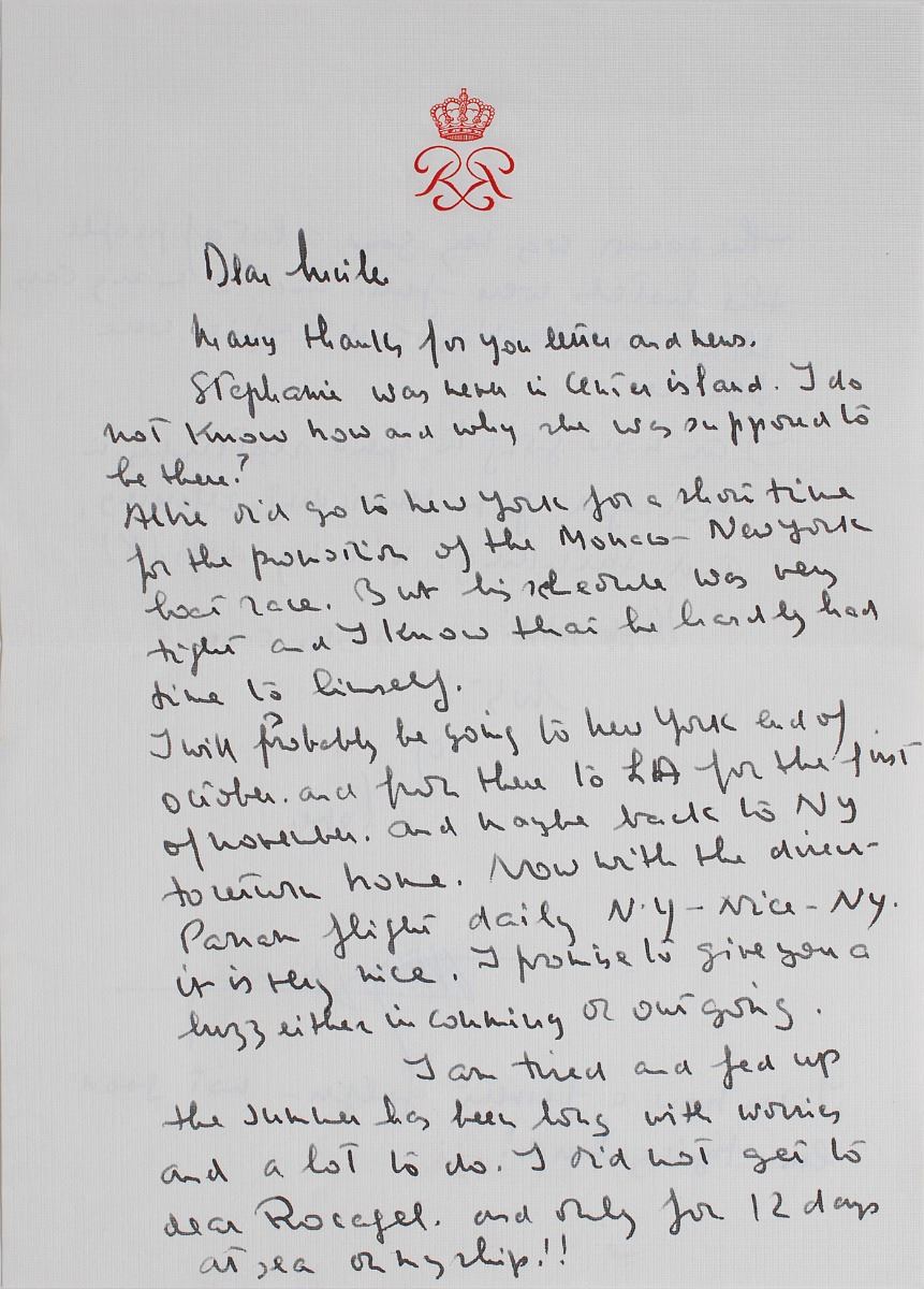 ALS signed “Rainier de Monaco,” one page both sides, 6 x 8.25, personal monogrammed letterhead, postmarked September 2, 1985. Letter to Lucile Palmaro, in part: “I will probably be going to New York end of October and from there to LA for the first of November, and maybe back to NY to return home. Now with the direct…flight daily NY–Nice–NY it is very nice. I promise to give you a buzz either incoming or outgoing…The season was very good, a lot of people, the hotels were full, and so many cars that circulation and traffic were terrible.” Rainier adds a brief postscript, “I am now a fervent golfer—not good but trying hard.” In fine condition. Accompanied by the original mailing envelope, addressed in Rainier’s own hand.