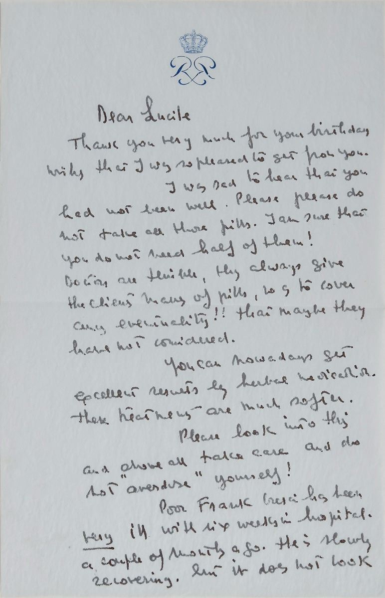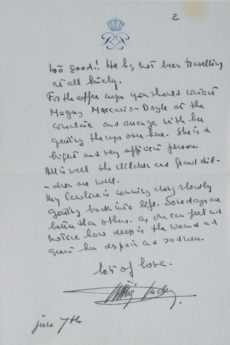 ALS signed “Rainier de Monaco,” two pages, 5.25 x 8.25, personal monogrammed letterhead, June 7, 1991. Letter to Lucile Palmaro, in part: "I was so sad to hear that you had not been well. Please please do not take all those pills. I am sure that you do not need half of them! Doctors are terrible…You can nowadays get excellent results by herbal medication…Please look into this and above all take care and do not 'overdose' yourself!…For the coffee cups you should contact Maguy Maccario-Doyle at the consulate and arrange with her getting the cups over here. She is a bright and very efficient person. All is well, the children and grandchildren are well. My Caroline is coming along slowly getting back into life. Some days are better than others. As one can feel and notice how deep is the wound and great her despair and sadness." In fine condition. Accompanied by the original mailing envelope, addressed in Rainier's own hand.