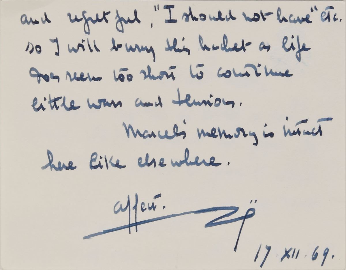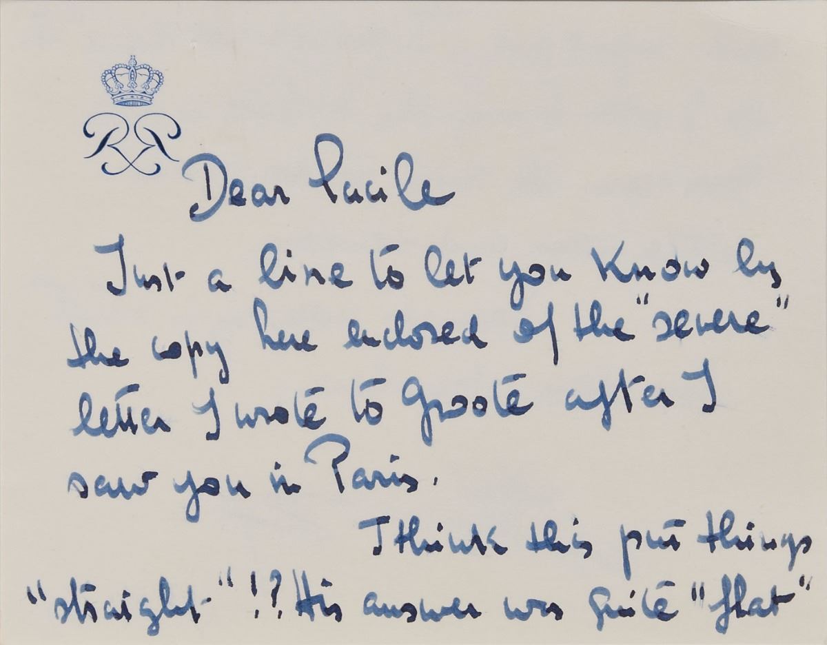 ALS signed “RP,” one page both sides, 5.25 x 4, personal monogrammed stationery, December 17, 1996. Letter to Lucile Palmaro, in part: "Just a line to let you know…the copy here enclosed of the 'severe' letter I wrote to Groote after I saw you in Paris. I think this put things 'straight'!? His answer was quite 'flat' and regretful. 'I should not have' etc. So I will bury this hatchet as life does seem too short to continue little wars and tensions." Includes the referenced "severe" letter addressed to Mr. W. Groote. In fine condition.